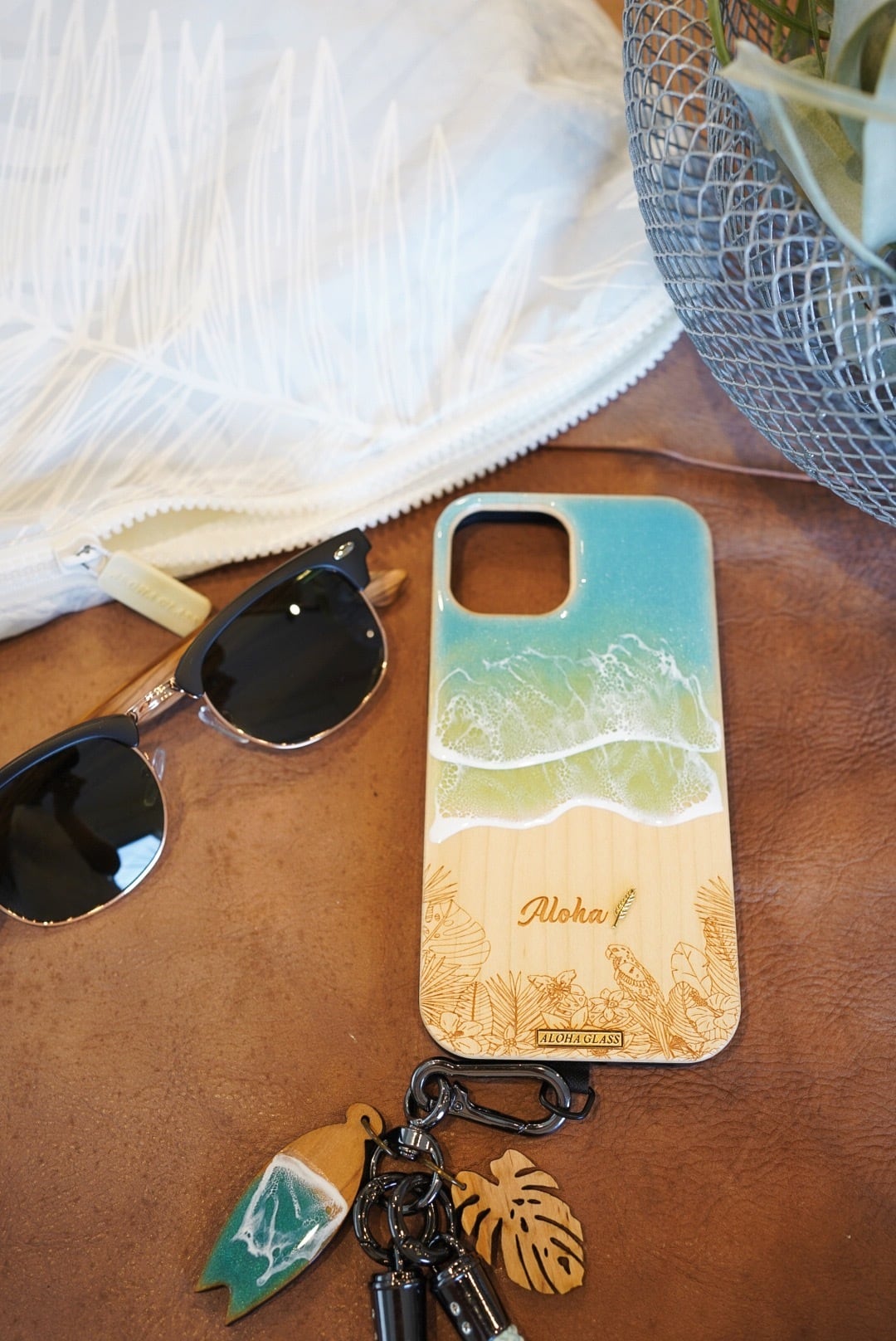 天然木製なのはもちろんのこと波のレジン加工も全て手作業で行うため同じ物が2度と生まれることはなく絶対に誰とも被ることのないあなただけのケースです。