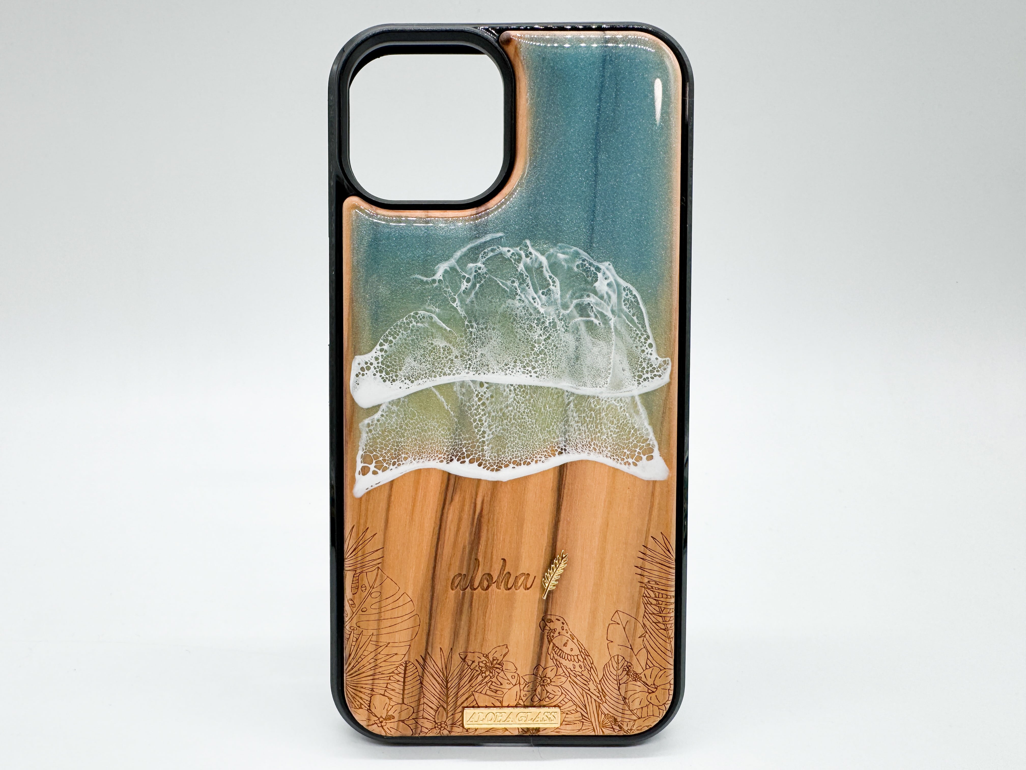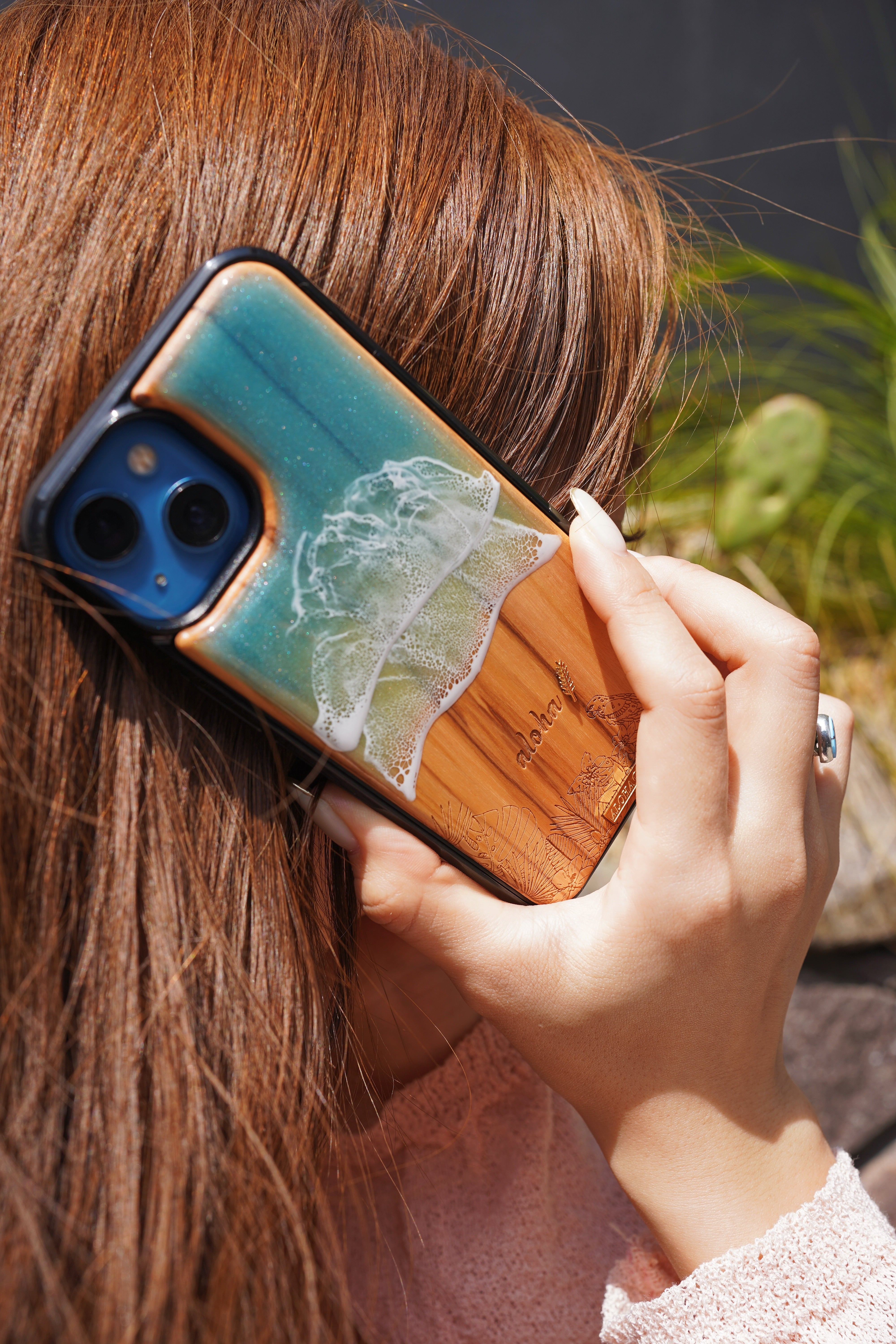 天然木製なのはもちろんのこと波のレジン加工も全て手作業で行うため同じ物が2度と生まれることはなく絶対に誰とも被ることのないあなただけのケースです。