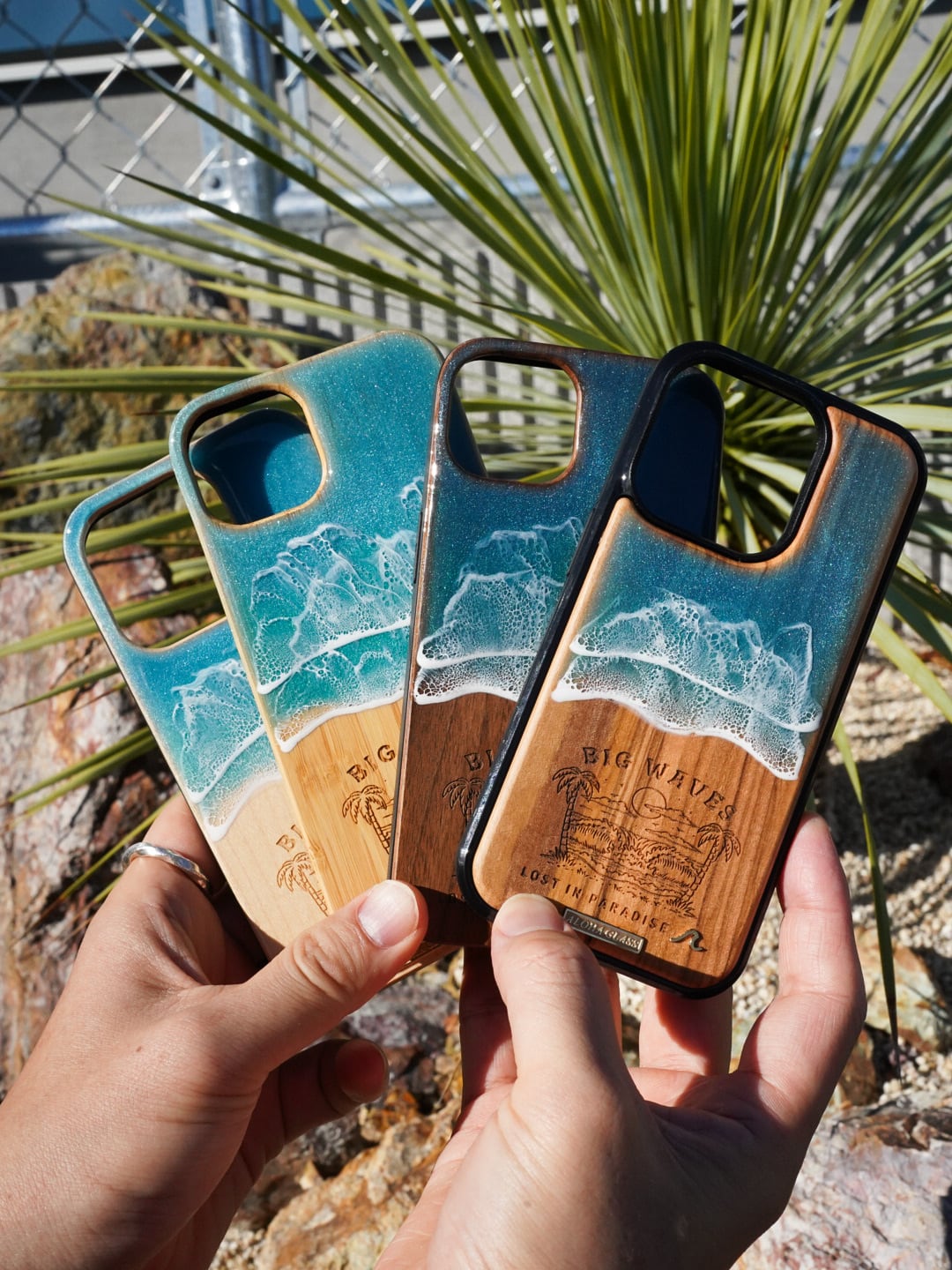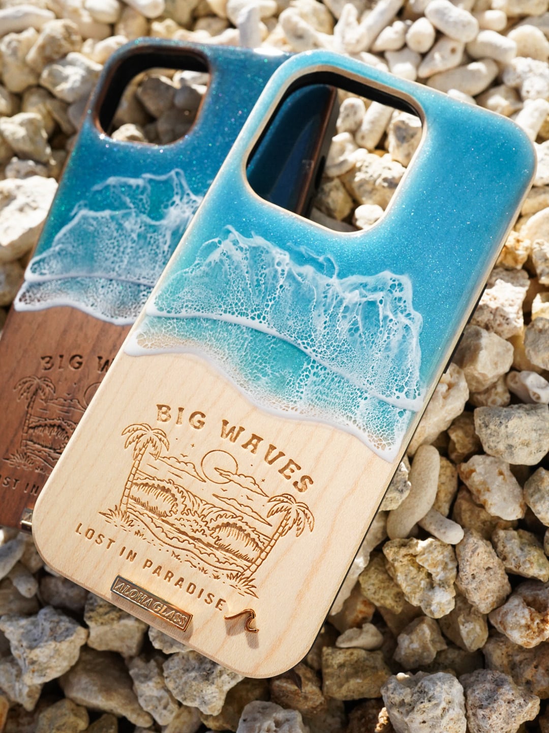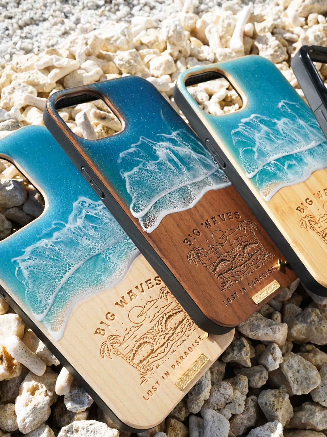 天然木製なのはもちろんのこと波のレジン加工も全て手作業で行いALOHA GLASSしか作れない、絶対に誰とも被ることのないあなただけのケースです。