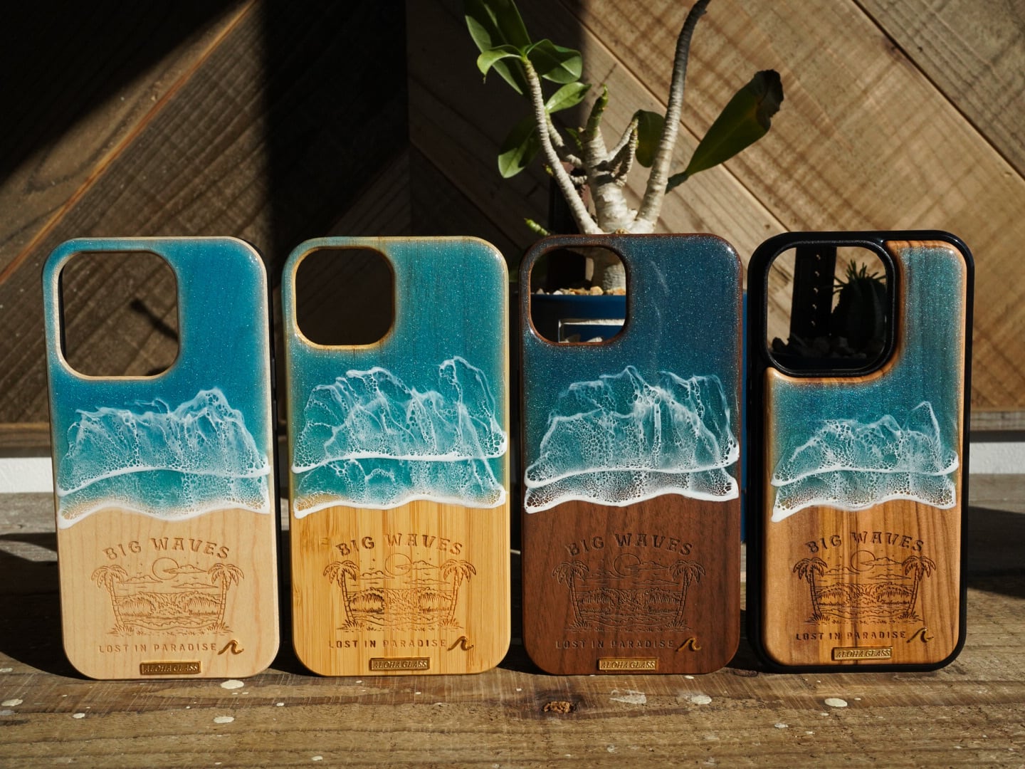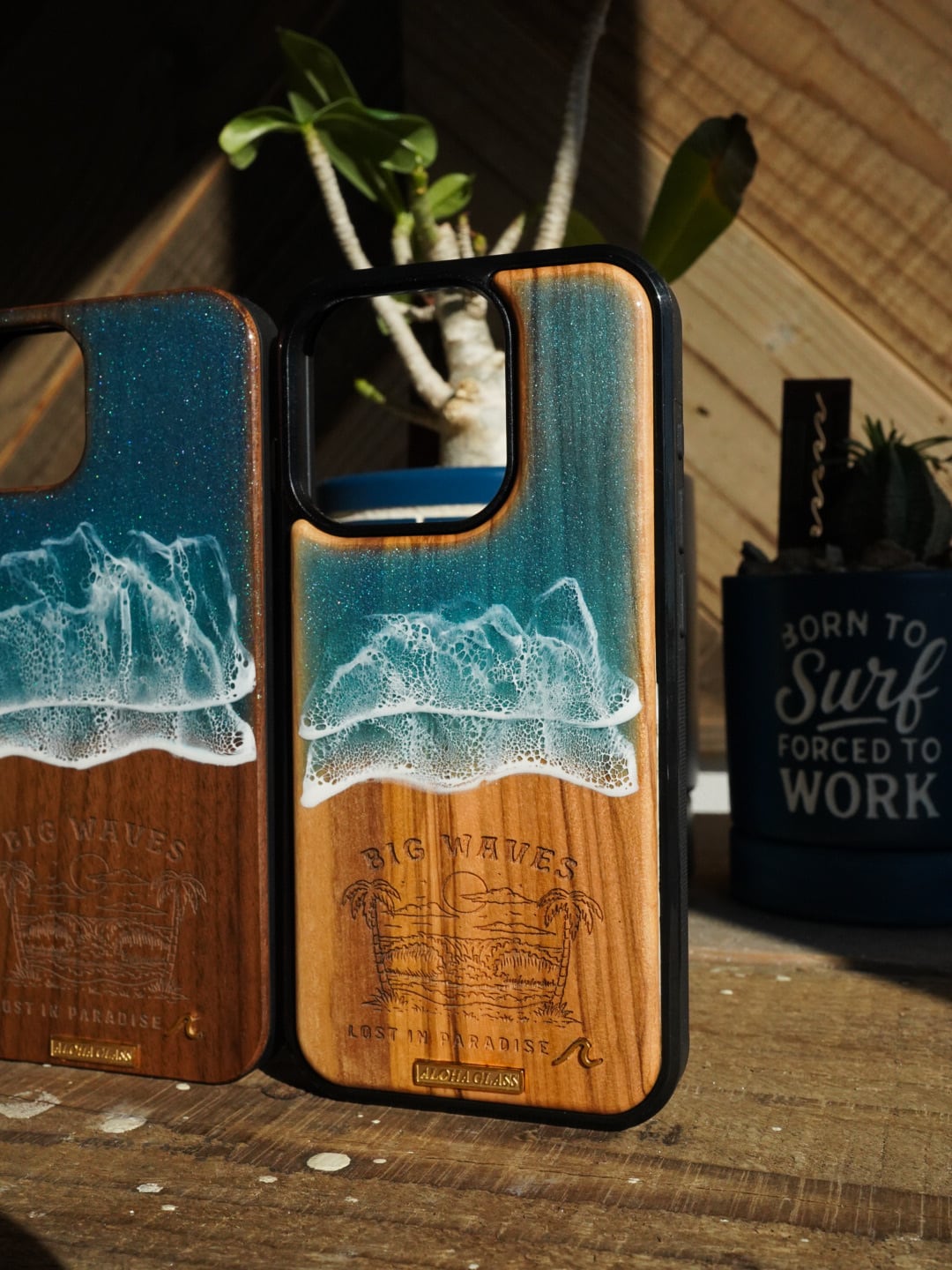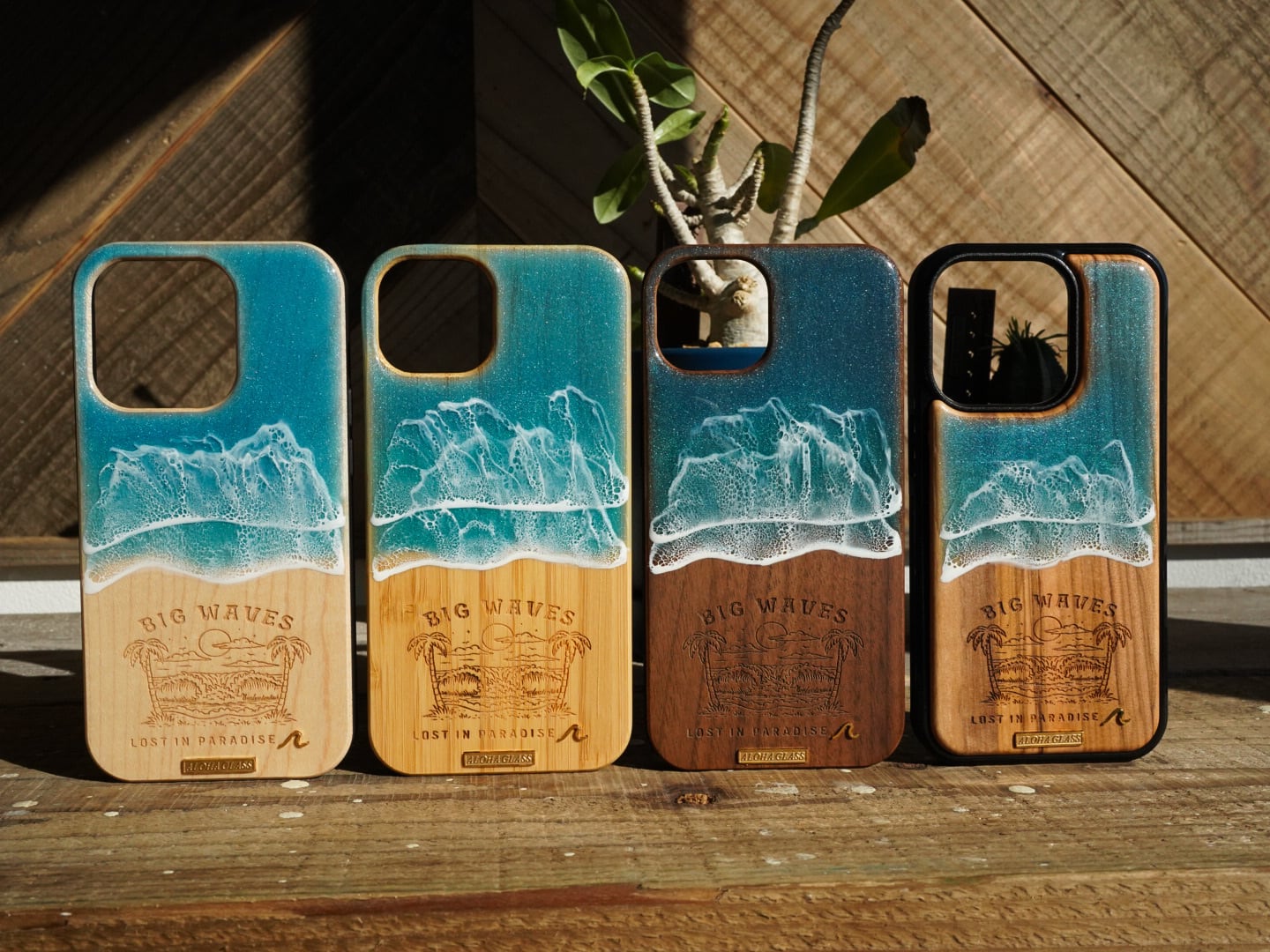 天然木製なのはもちろんのこと波のレジン加工も全て手作業で行いALOHA GLASSしか作れない、絶対に誰とも被ることのないあなただけのケースです。