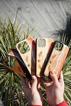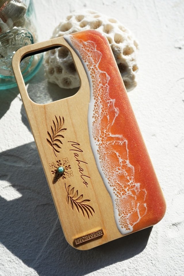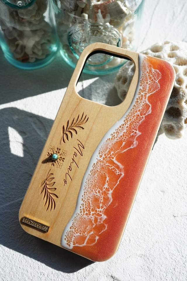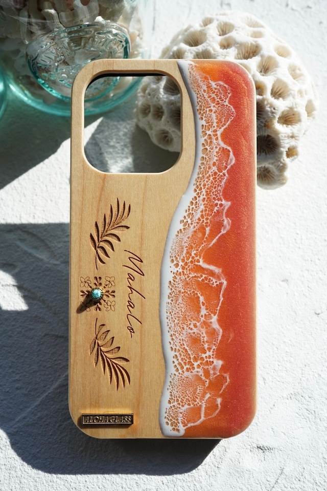天然木製なのはもちろんのこと波のレジン加工も全て手作業で行うため同じ物が2度と生まれることはなく絶対に誰とも被ることのないあなただけのケースです。