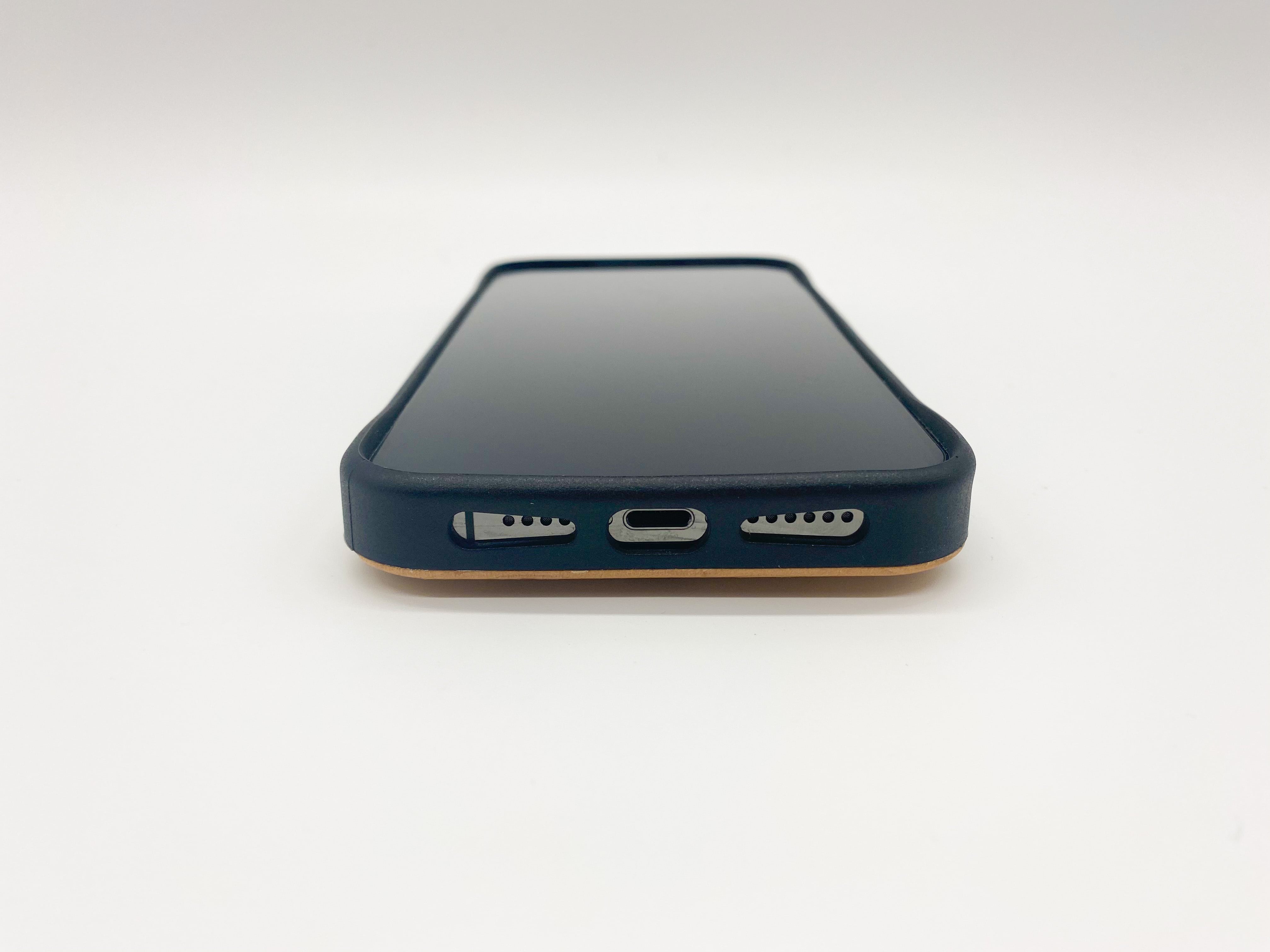 レーザーでデザインを彫ったWOOD+ブラックラバー(天然木+ブラックラバー)のケースになります。ケース下部にはオリジナルブランドロゴプレートをプラスしました。