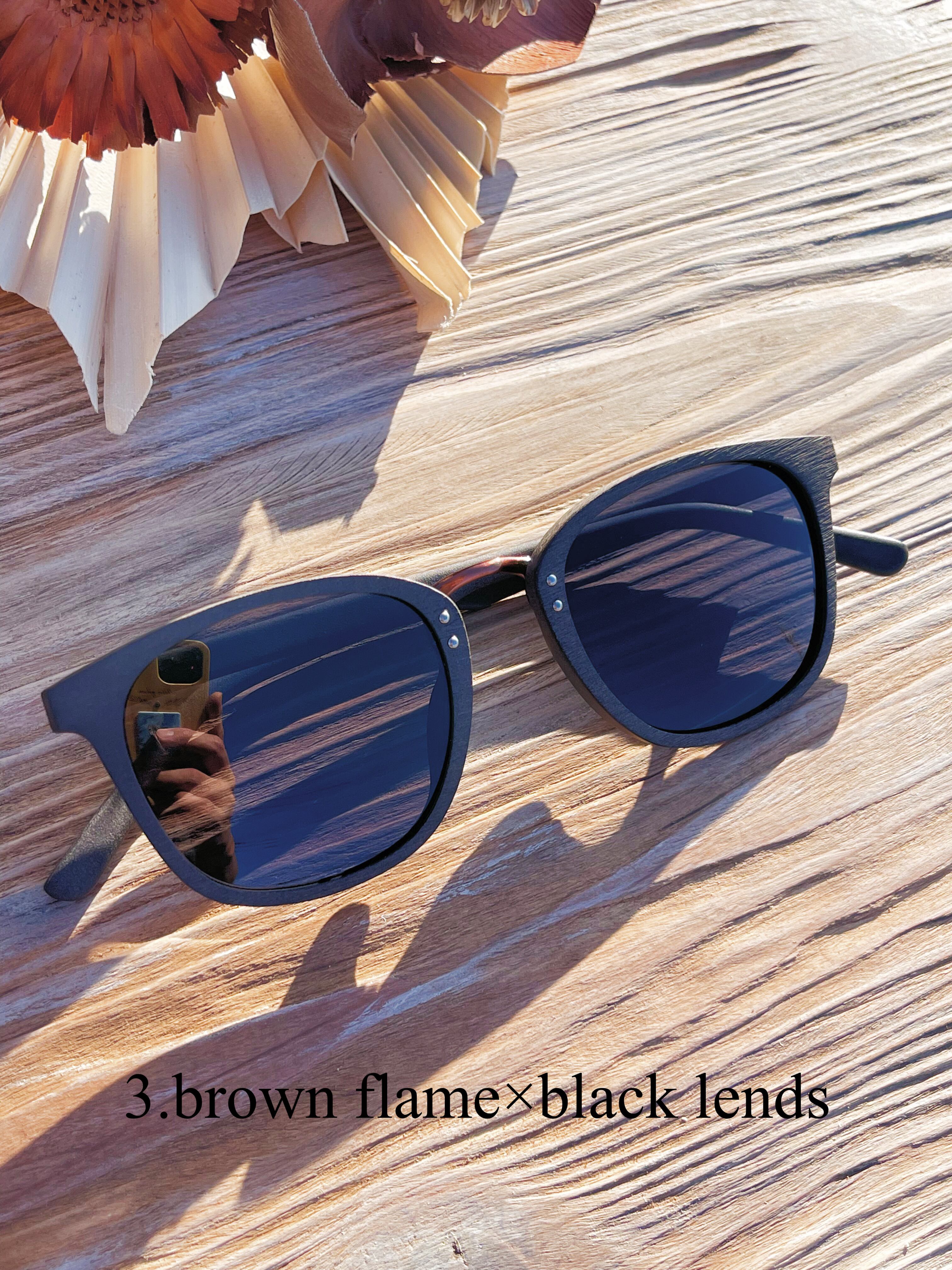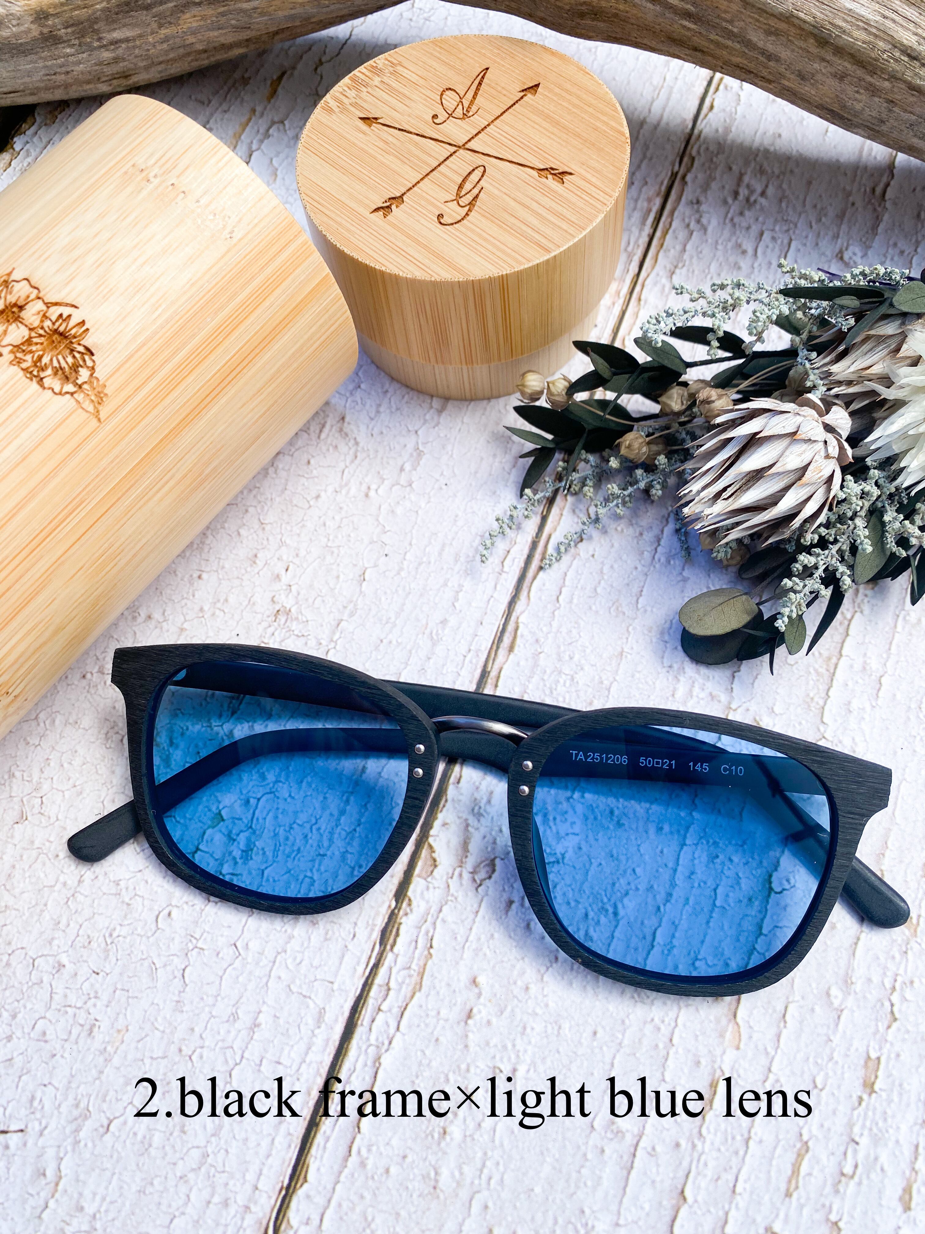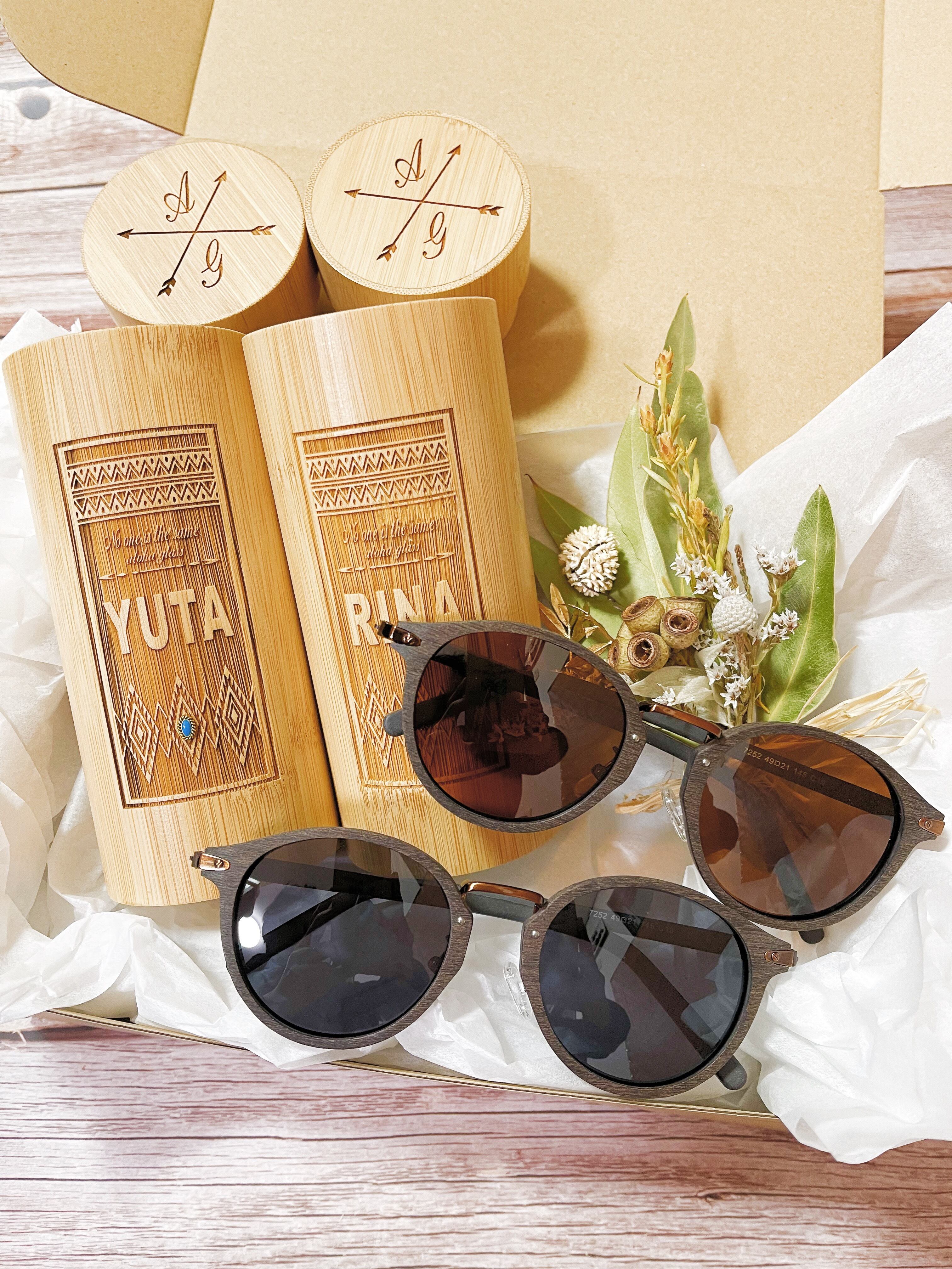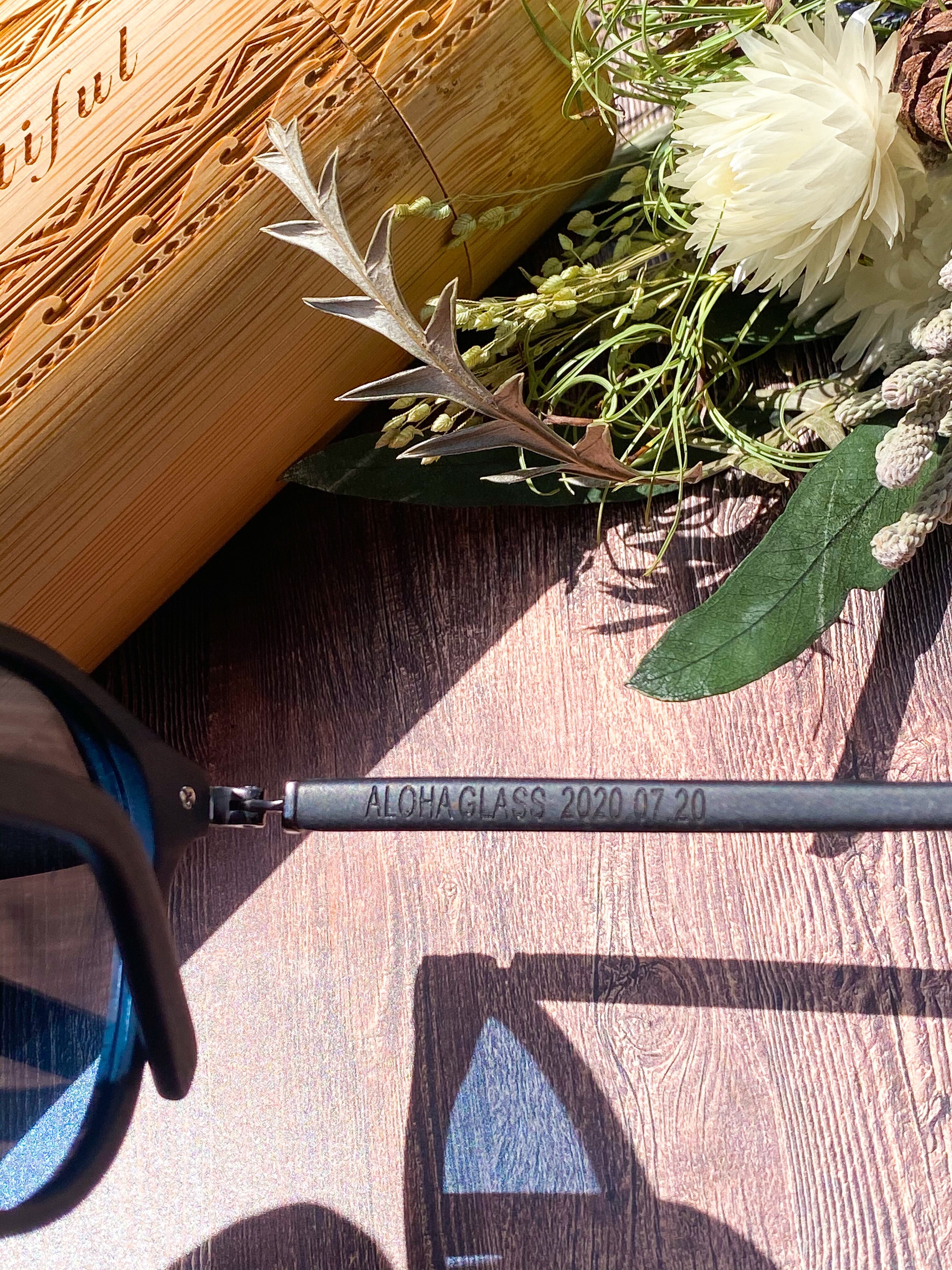 天然木で一点一点ハンドメイドで丁寧に製作したサングラス。そして、テンプル部分にお好きな文字を彫ることができます。※ブランド名はデフォルトで刻印が入っています。