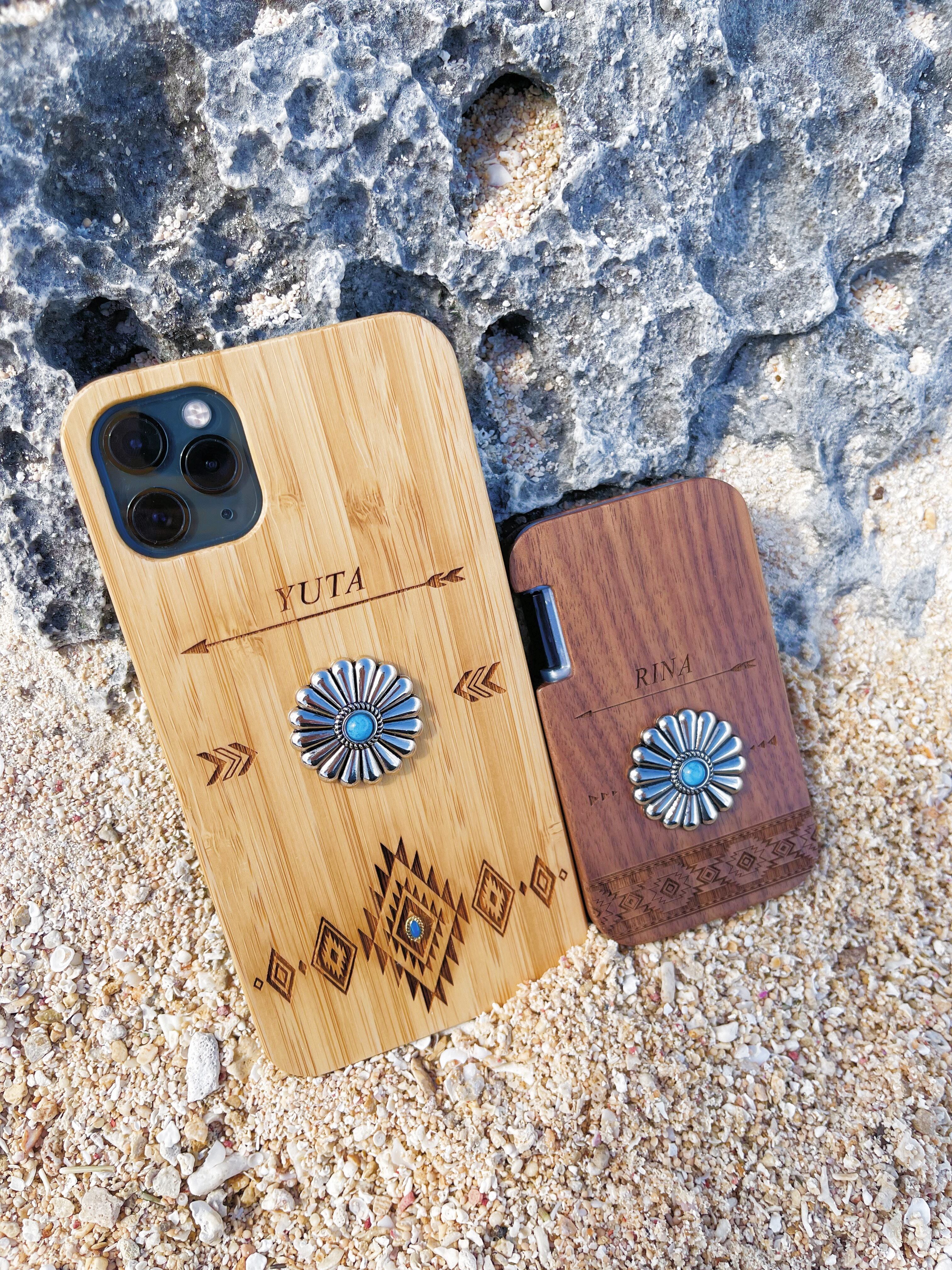 レーザーでデザインを彫ったWOOD+ブラックラバー(天然木+ブラックラバー)のケースになります。