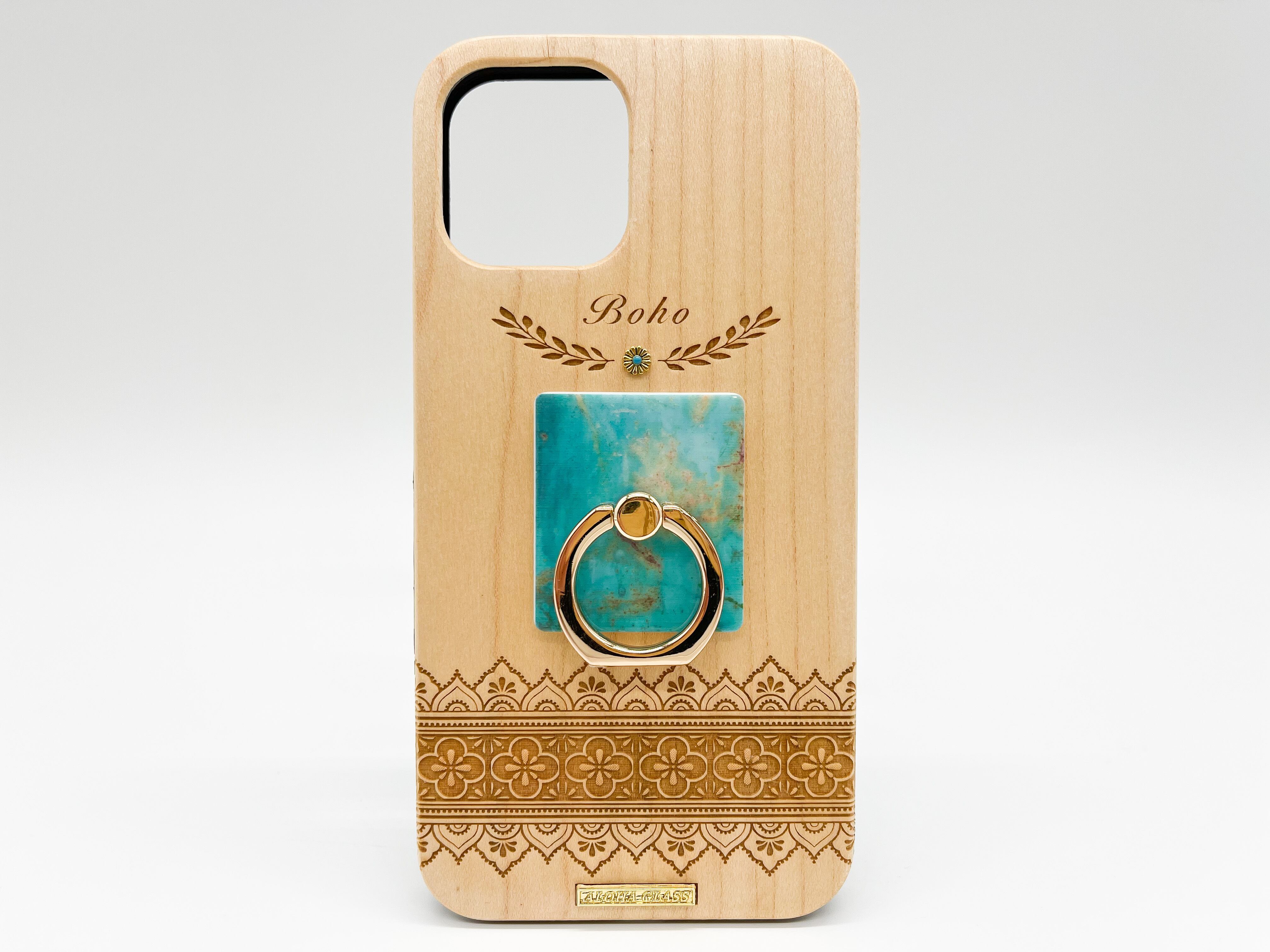 レーザーでデザインを彫ったWOOD+ブラックラバー(天然木+ブラックラバー)のケースになります。ケース下部にはオリジナルブランドロゴプレートをプラスしました。