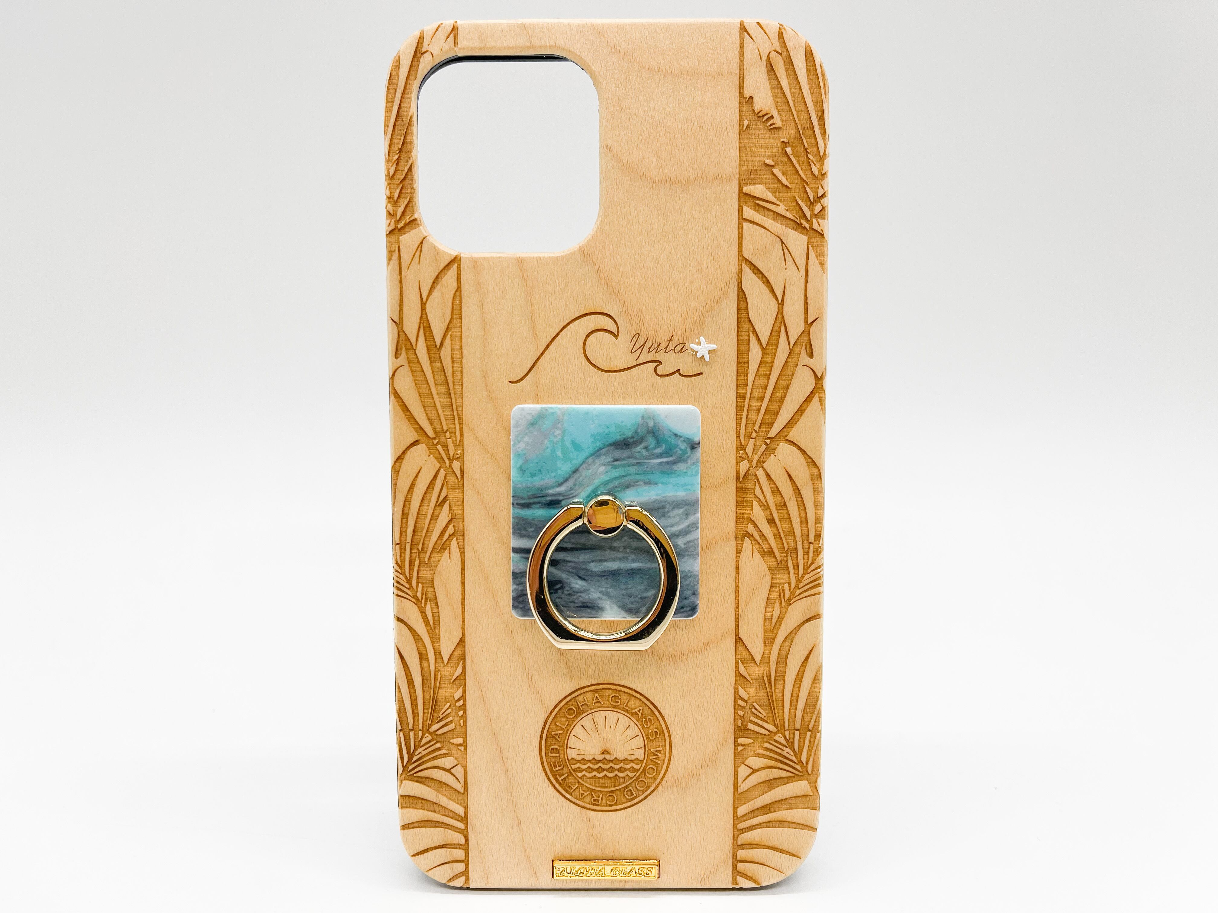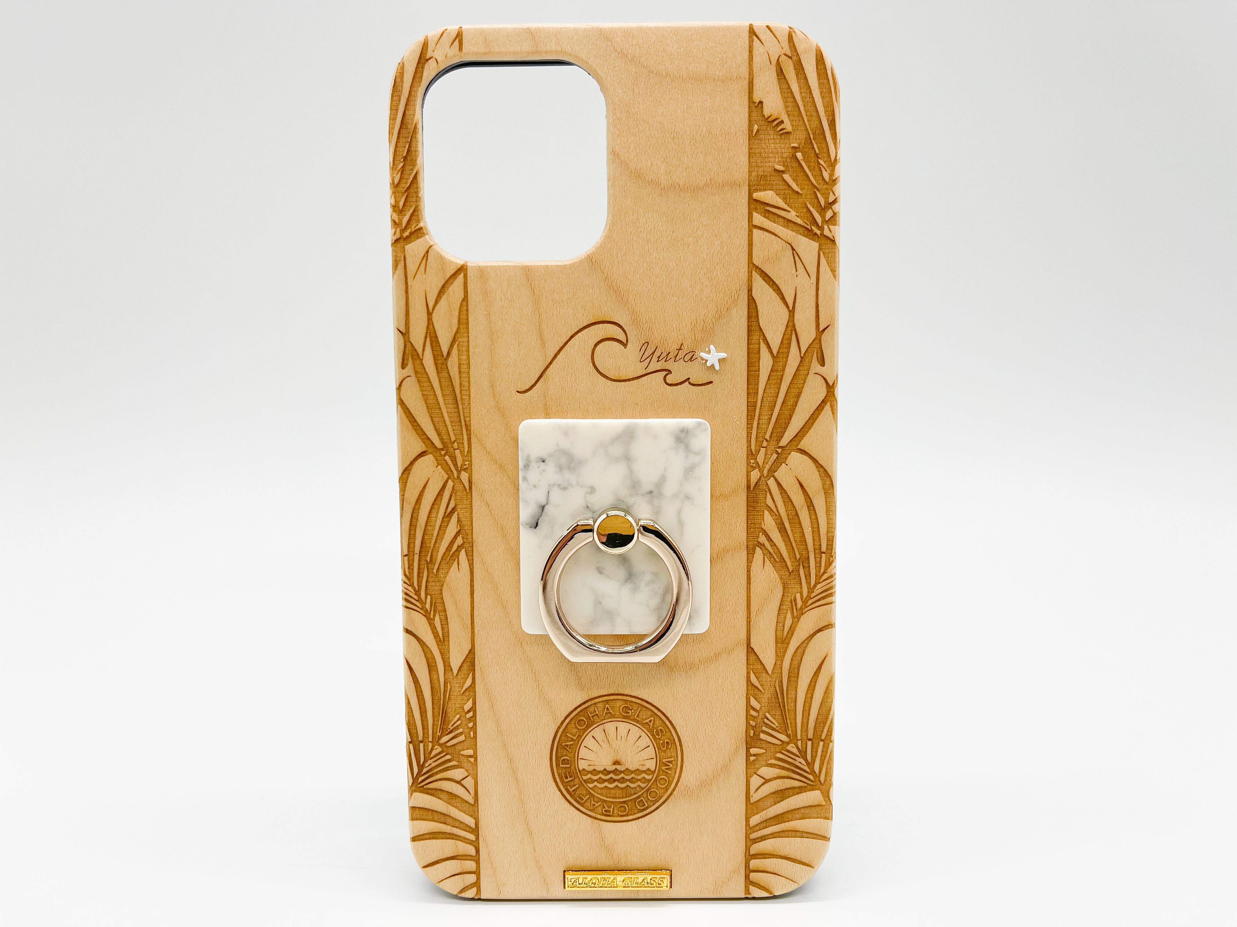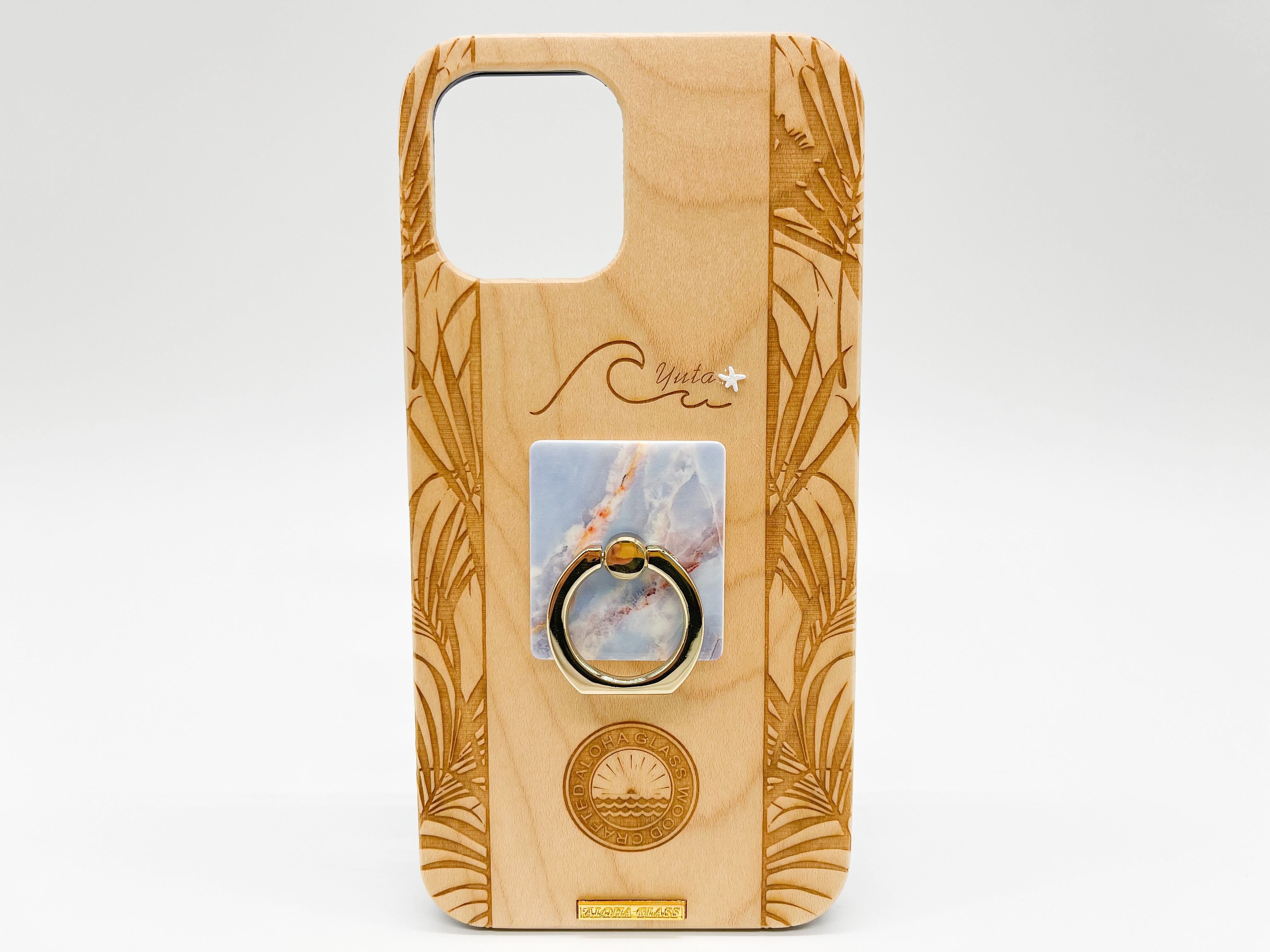 レーザーでデザインを彫ったWOOD+ブラックラバー(天然木+ブラックラバー)のケースになります。ケース下部にはオリジナルブランドロゴプレートをプラスしました。