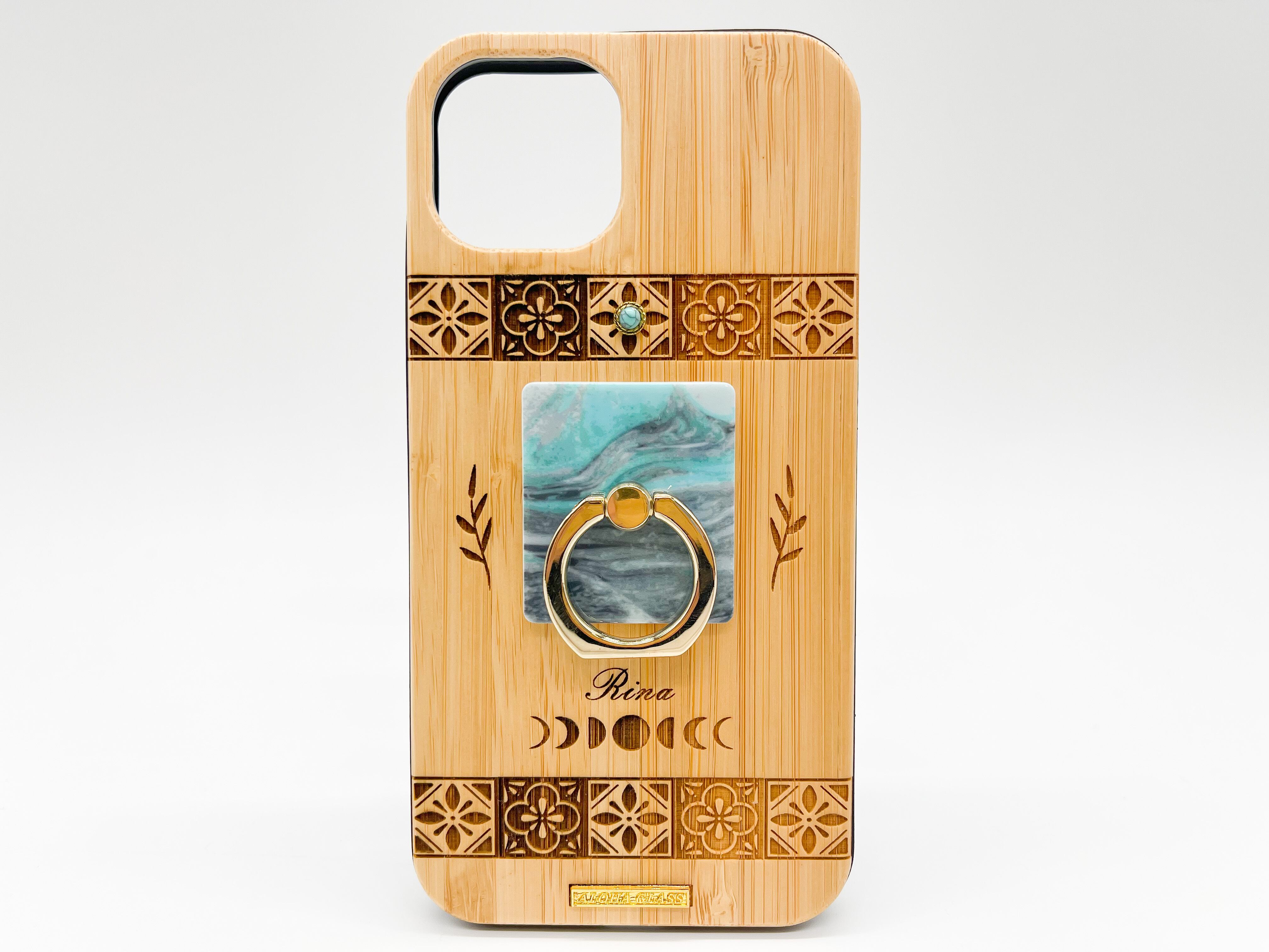 レーザーでデザインを彫ったWOOD+ブラックラバー(天然木+ブラックラバー)のケースになります。ケース下部にはオリジナルブランドロゴプレートをプラスしました。