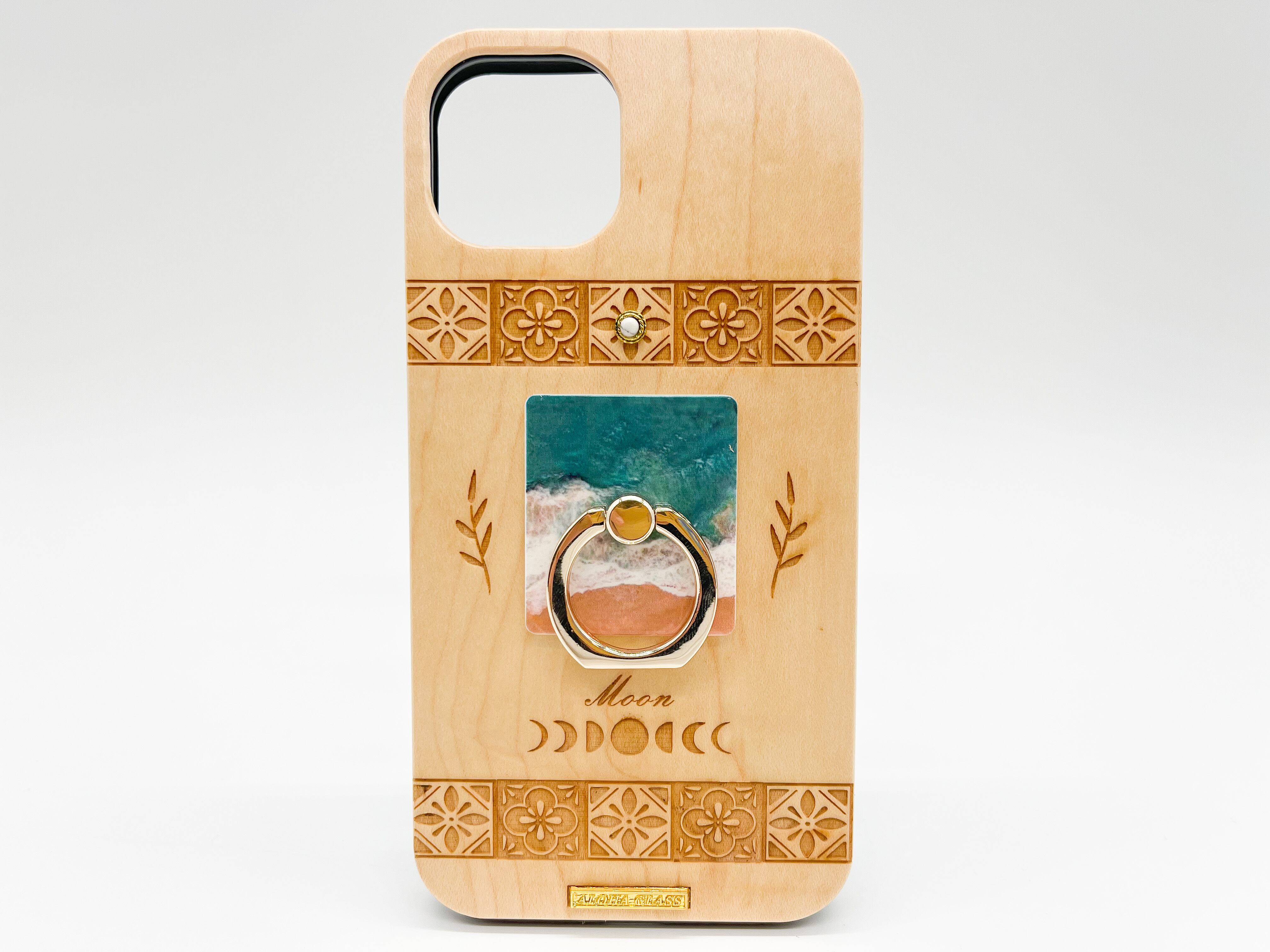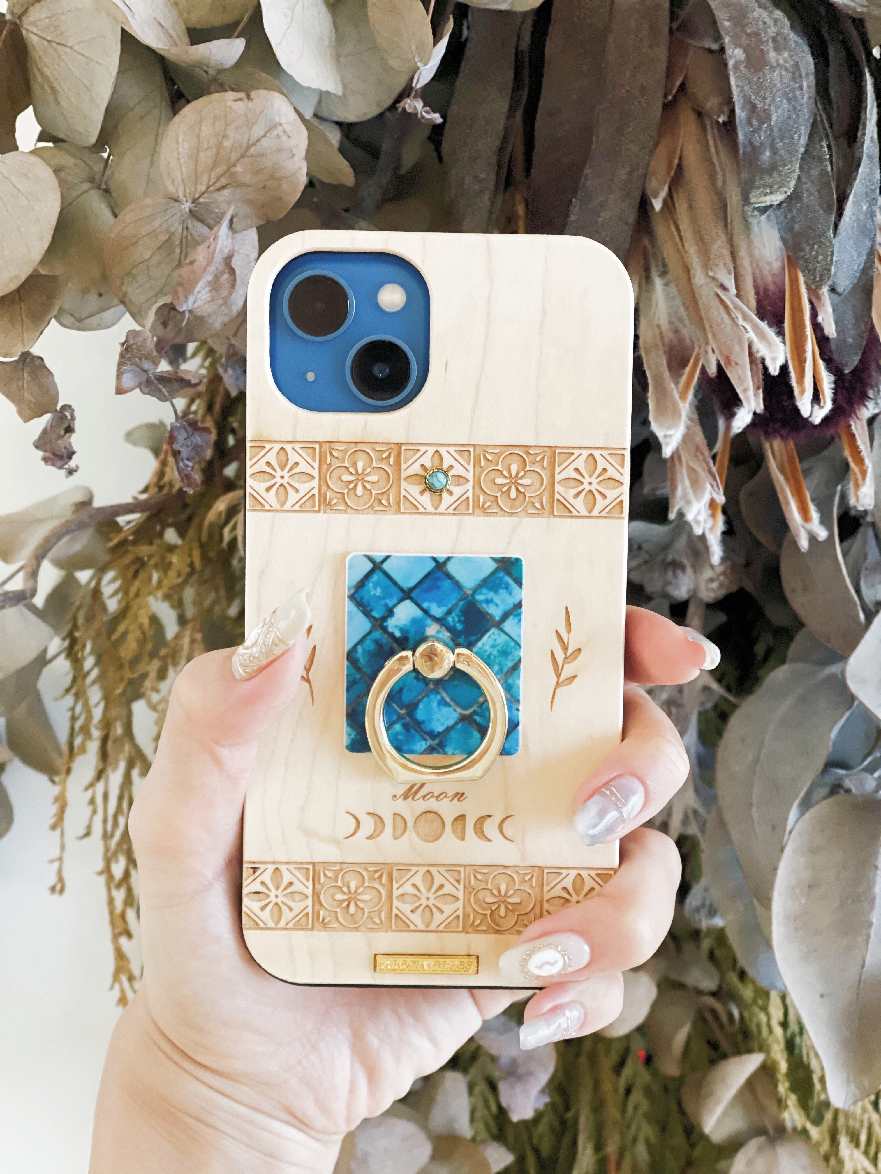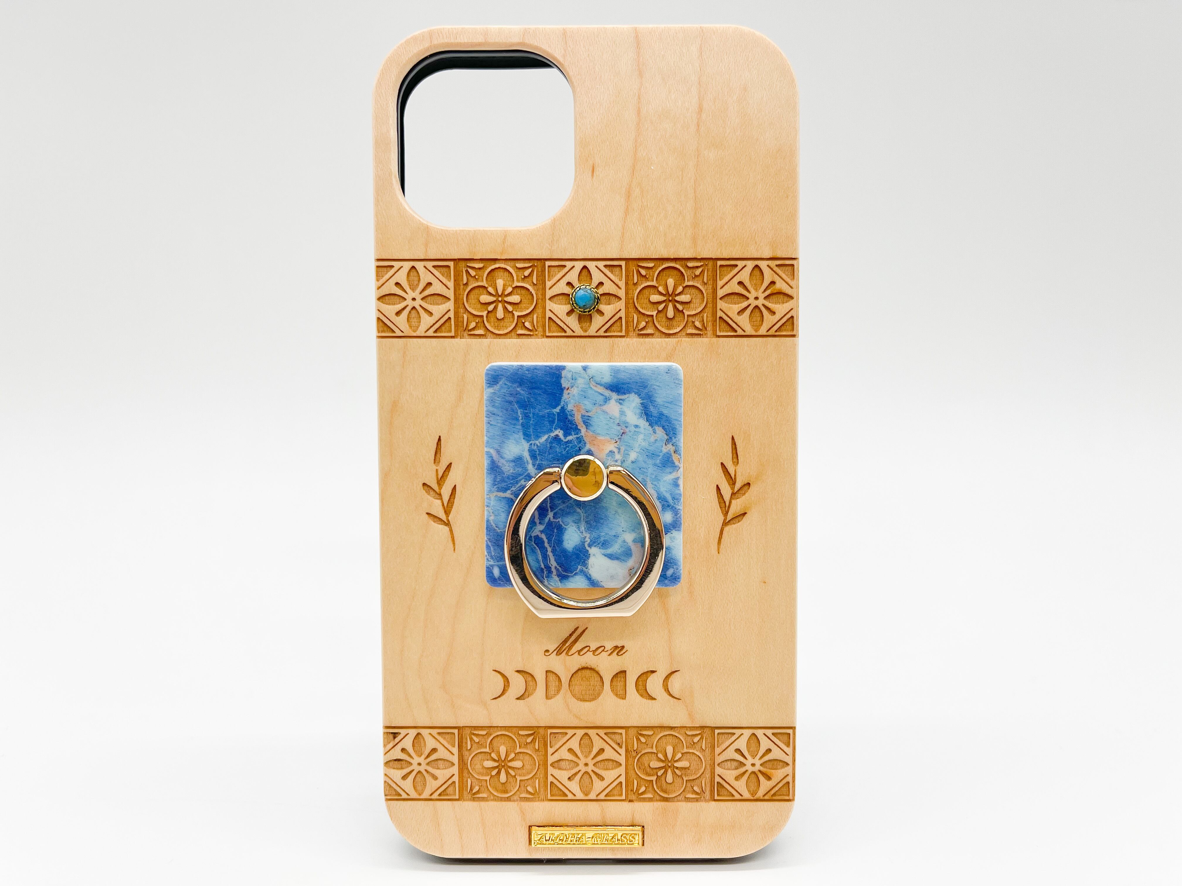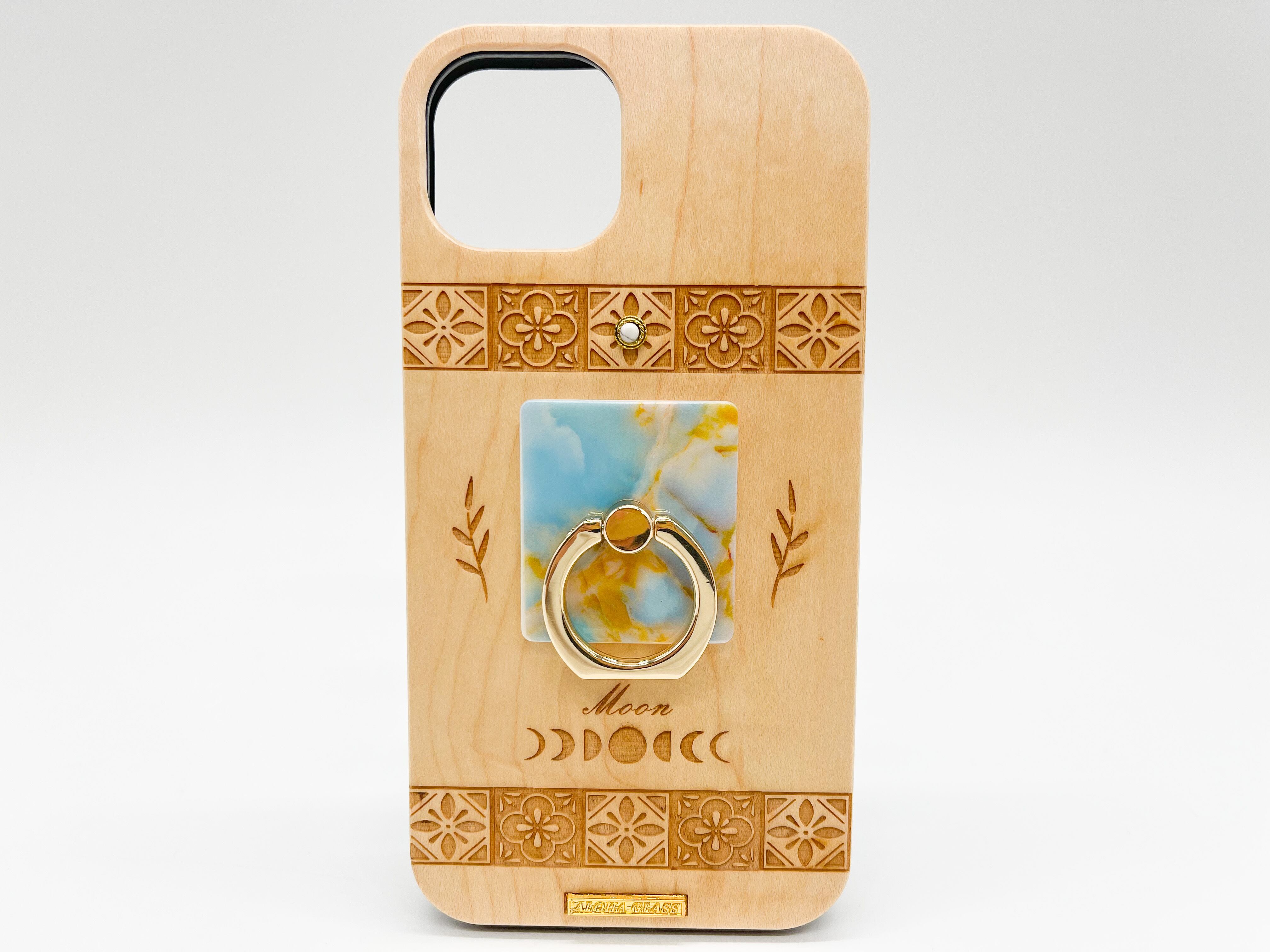 レーザーでデザインを彫ったWOOD+ブラックラバー(天然木+ブラックラバー)のケースになります。ケース下部にはオリジナルブランドロゴプレートをプラスしました。