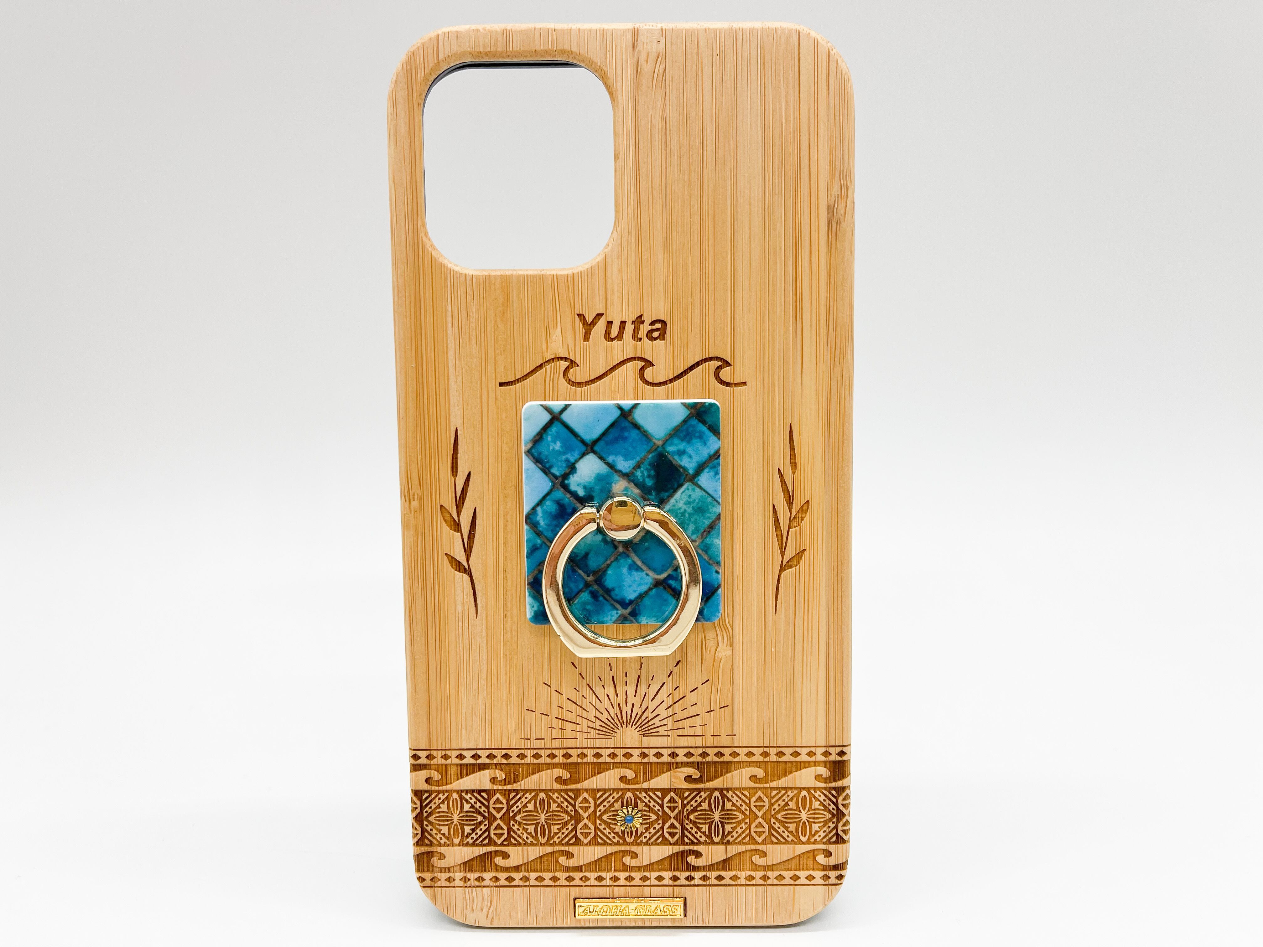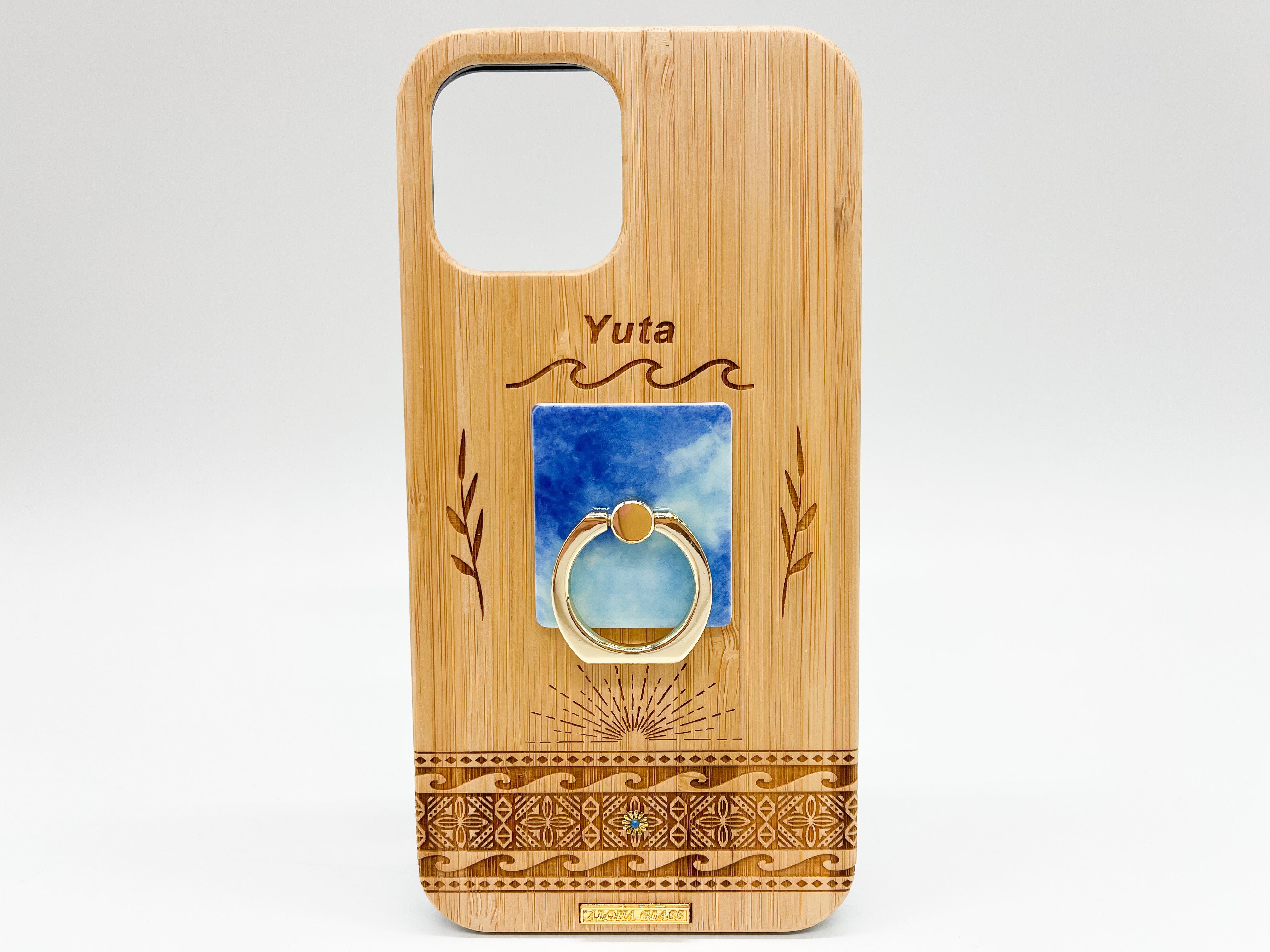レーザーでデザインを彫ったWOOD+ブラックラバー(天然木+ブラックラバー)のケースになります。ケース下部にはオリジナルブランドロゴプレートをプラスしました。