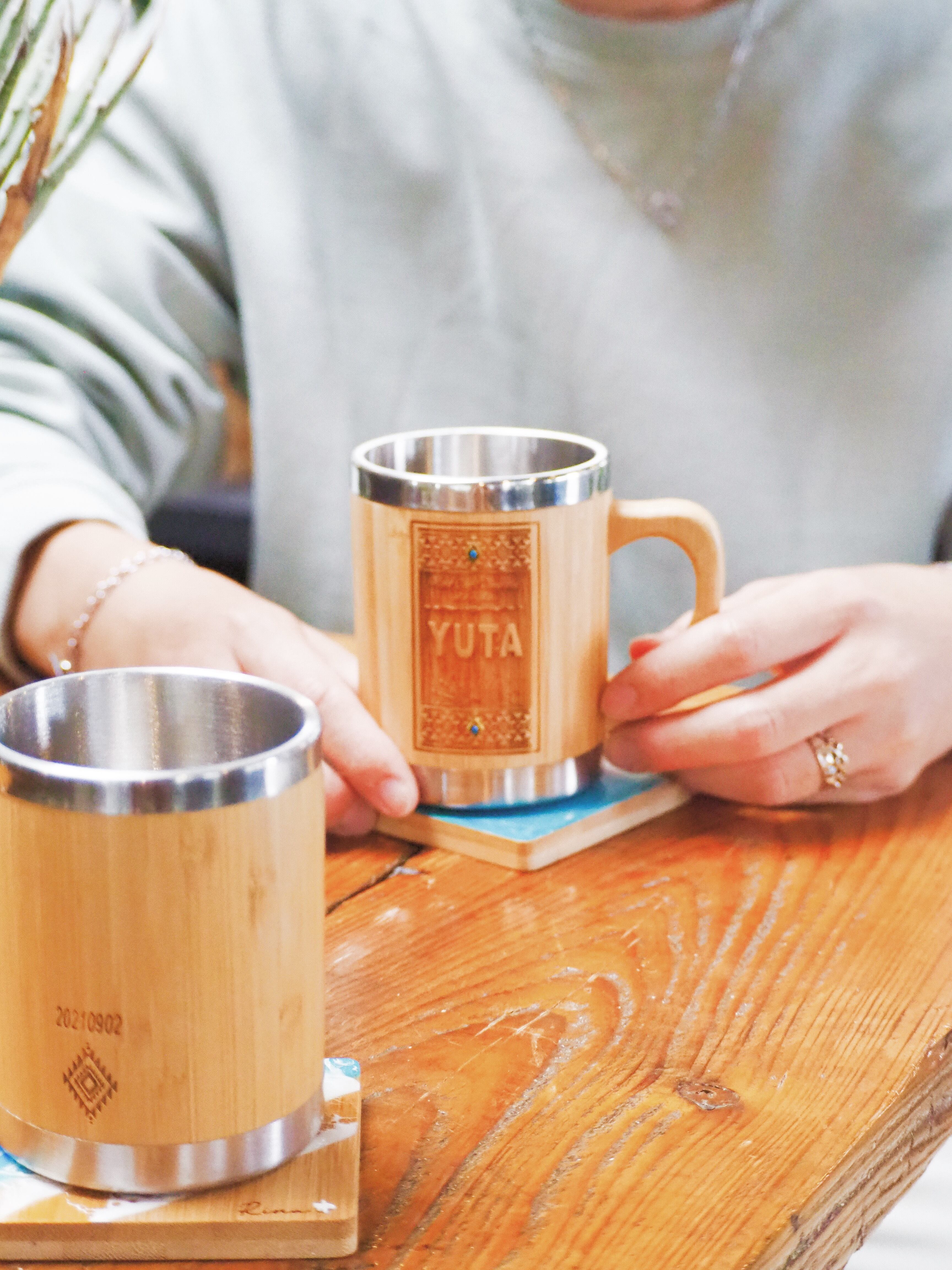 天然高級木材bamboo(竹)を使用。薄くシート状にし、マグ表面に巻きつけて仕上げています。 1つ1つ違う風合いを持つ天然木ならではの特徴を活かし、名入れをして世界に一つだけの名入れマグが完成します。