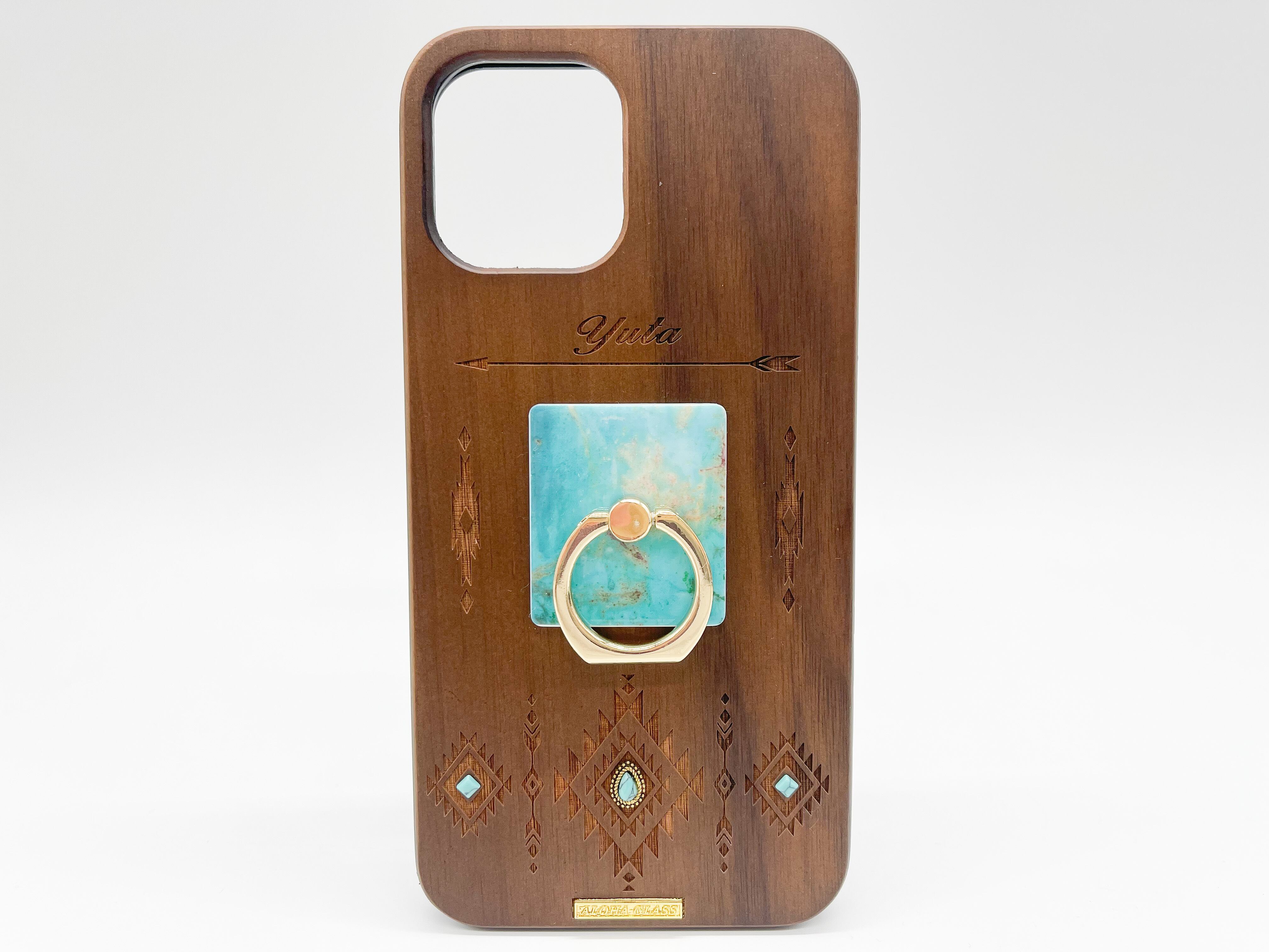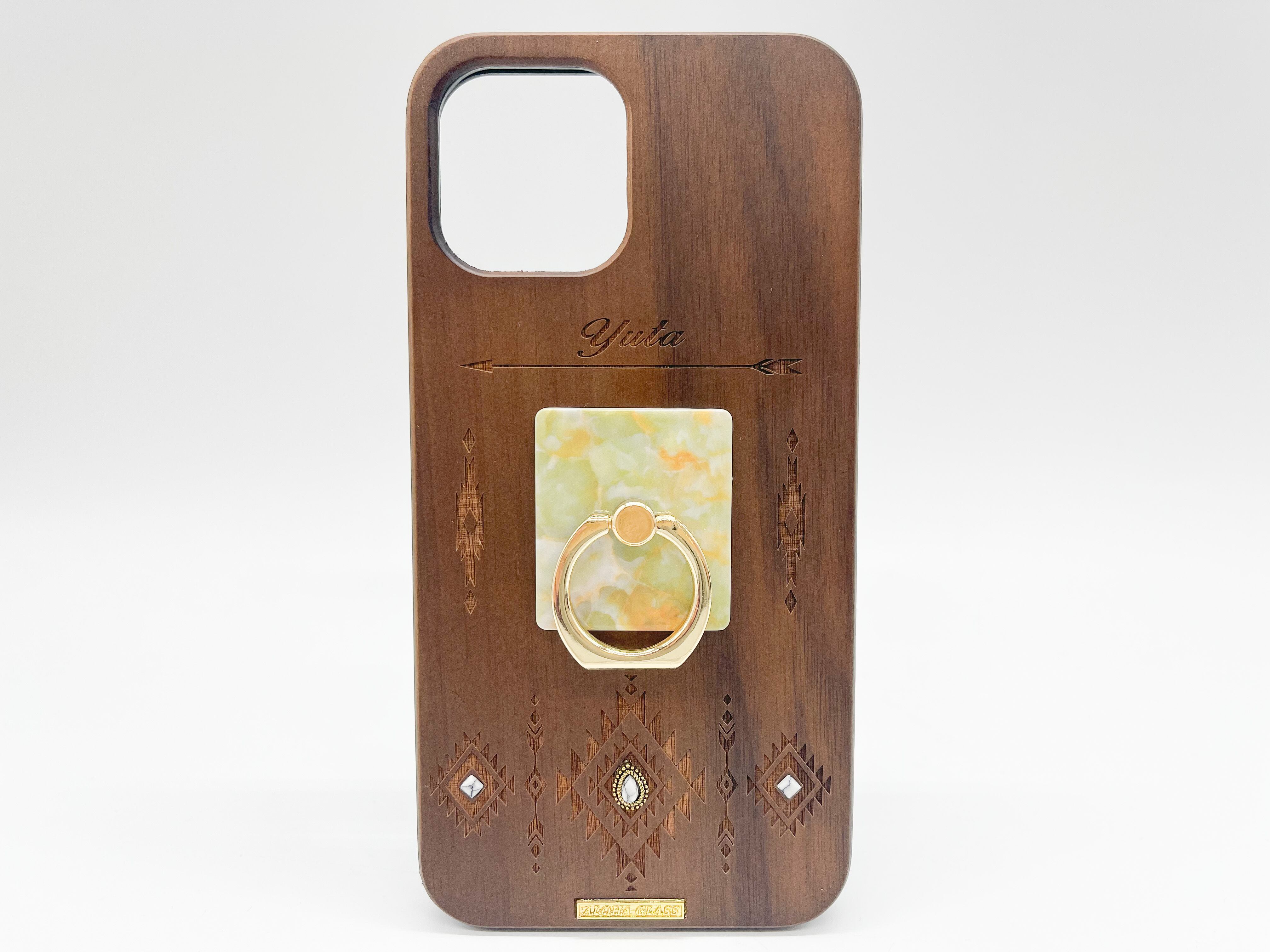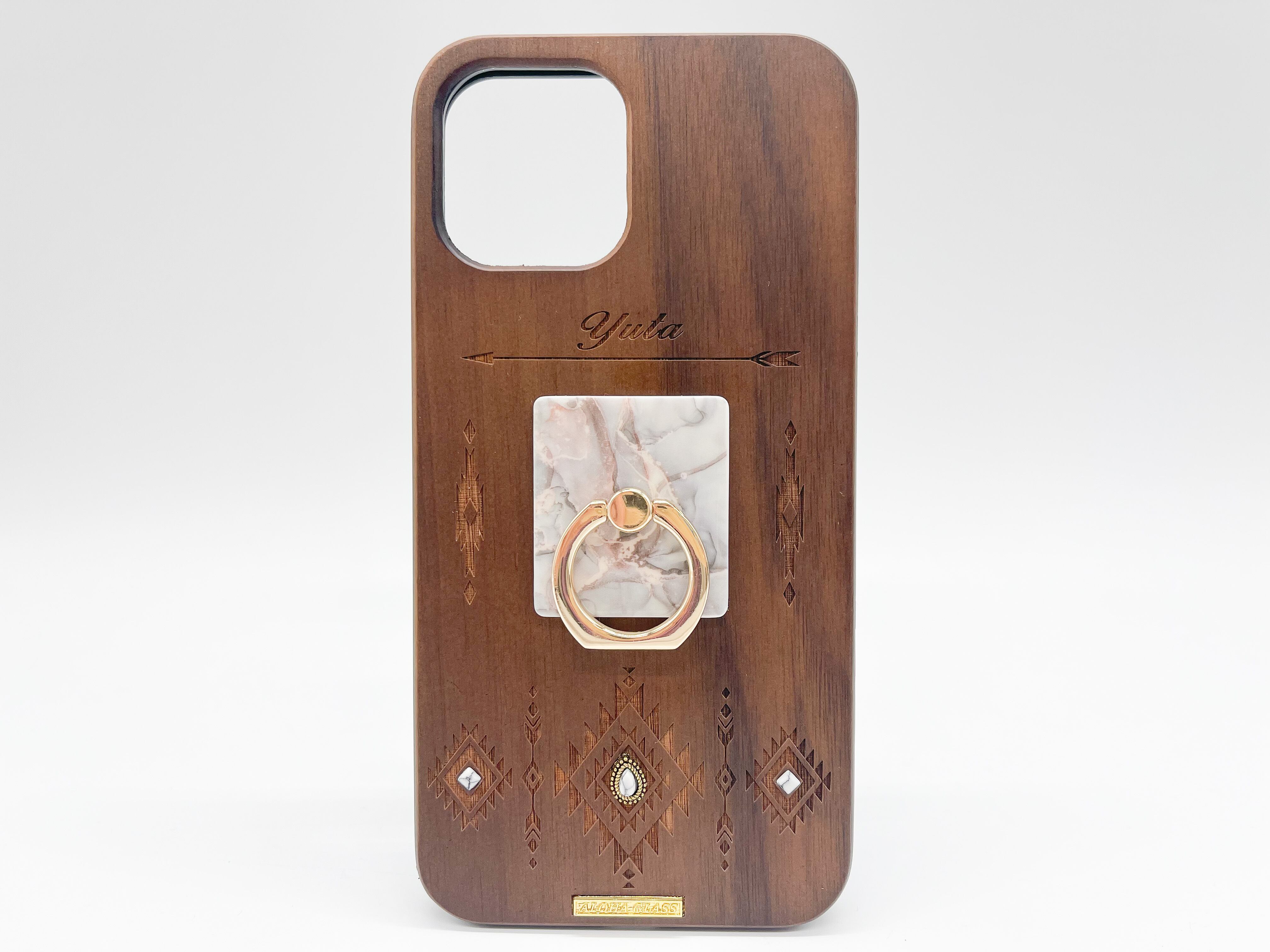 レーザーでデザインを彫ったWOOD+ブラックラバー(天然木+ブラックラバー)のケースになります。ケース下部にはオリジナルブランドロゴプレートをプラスしました。