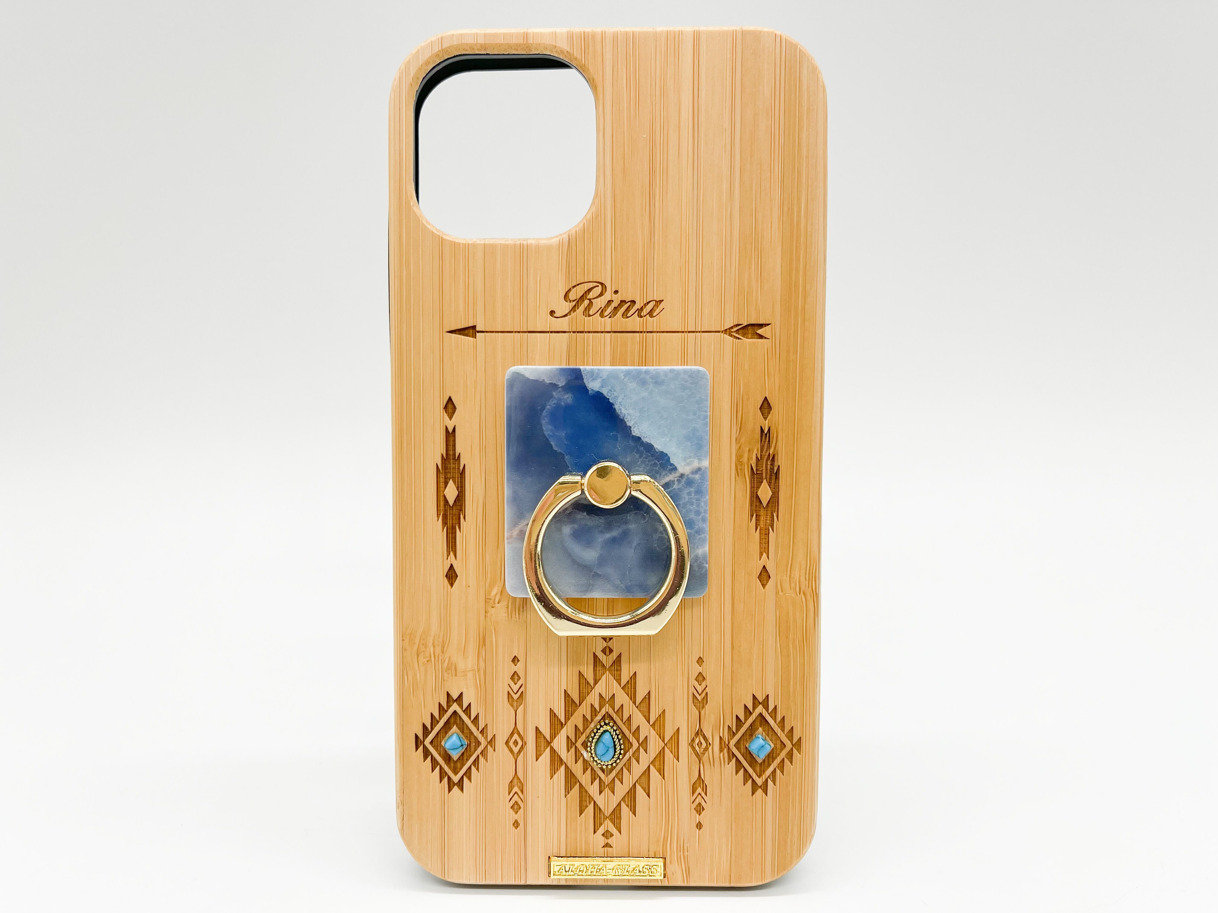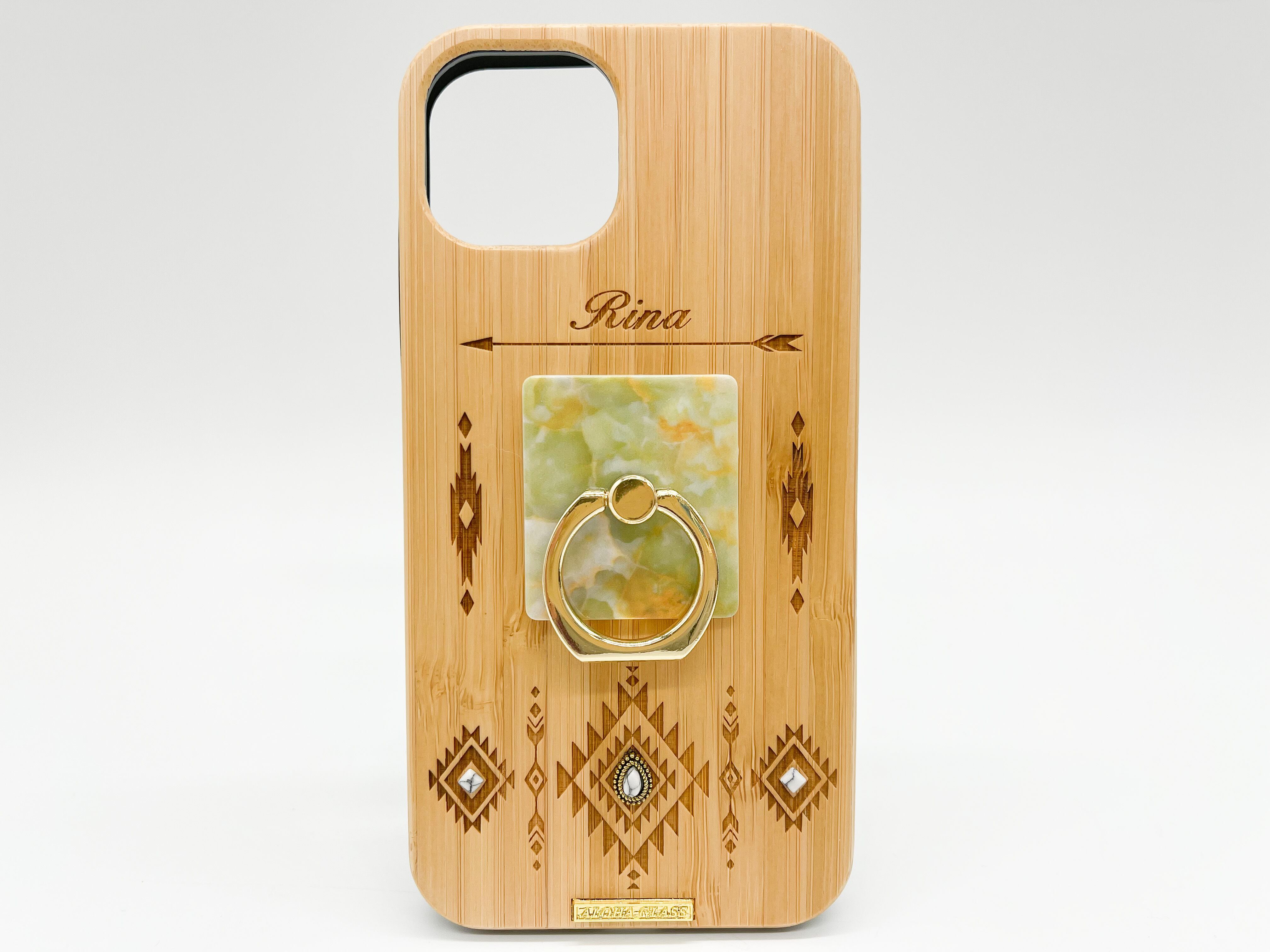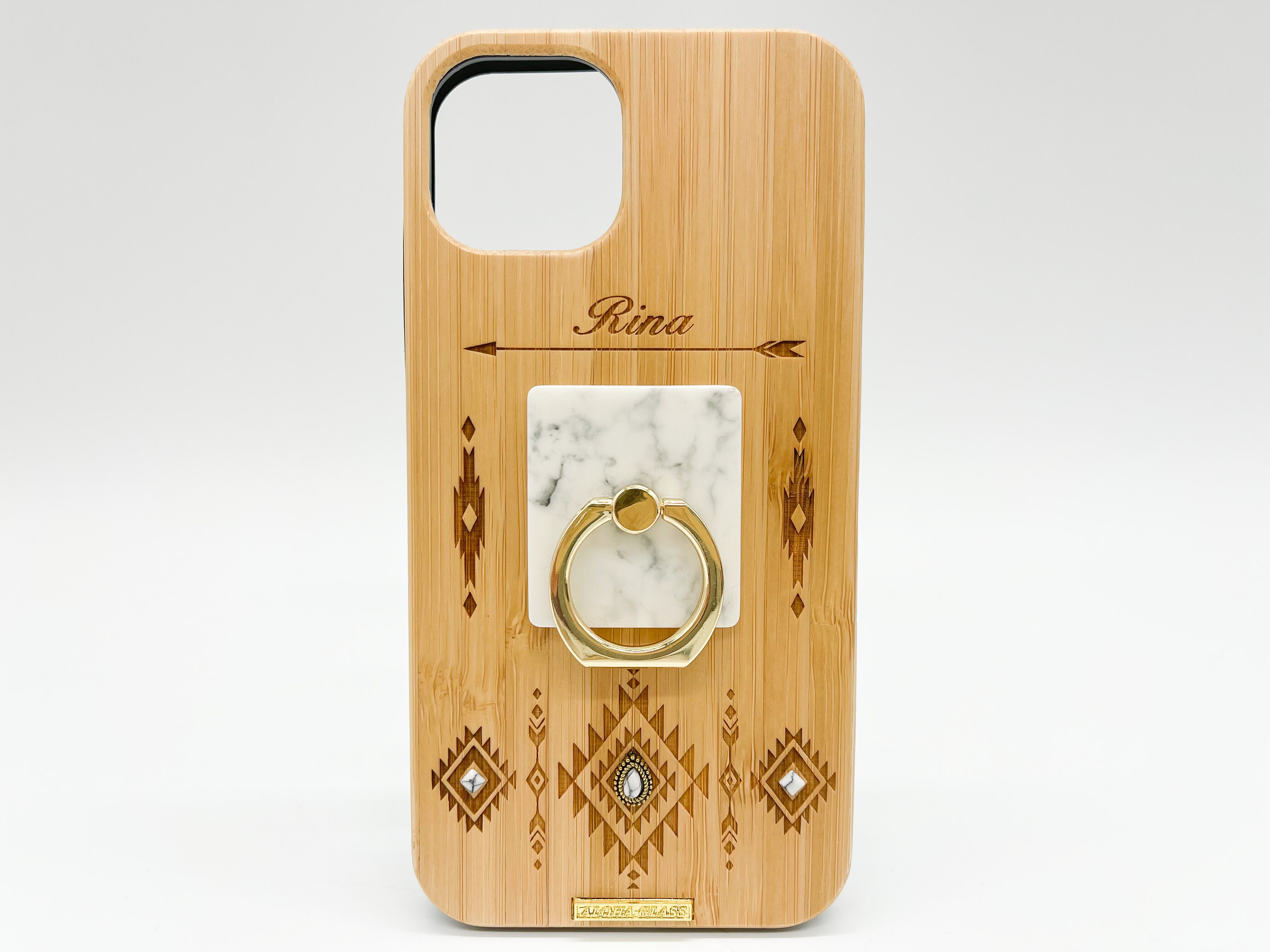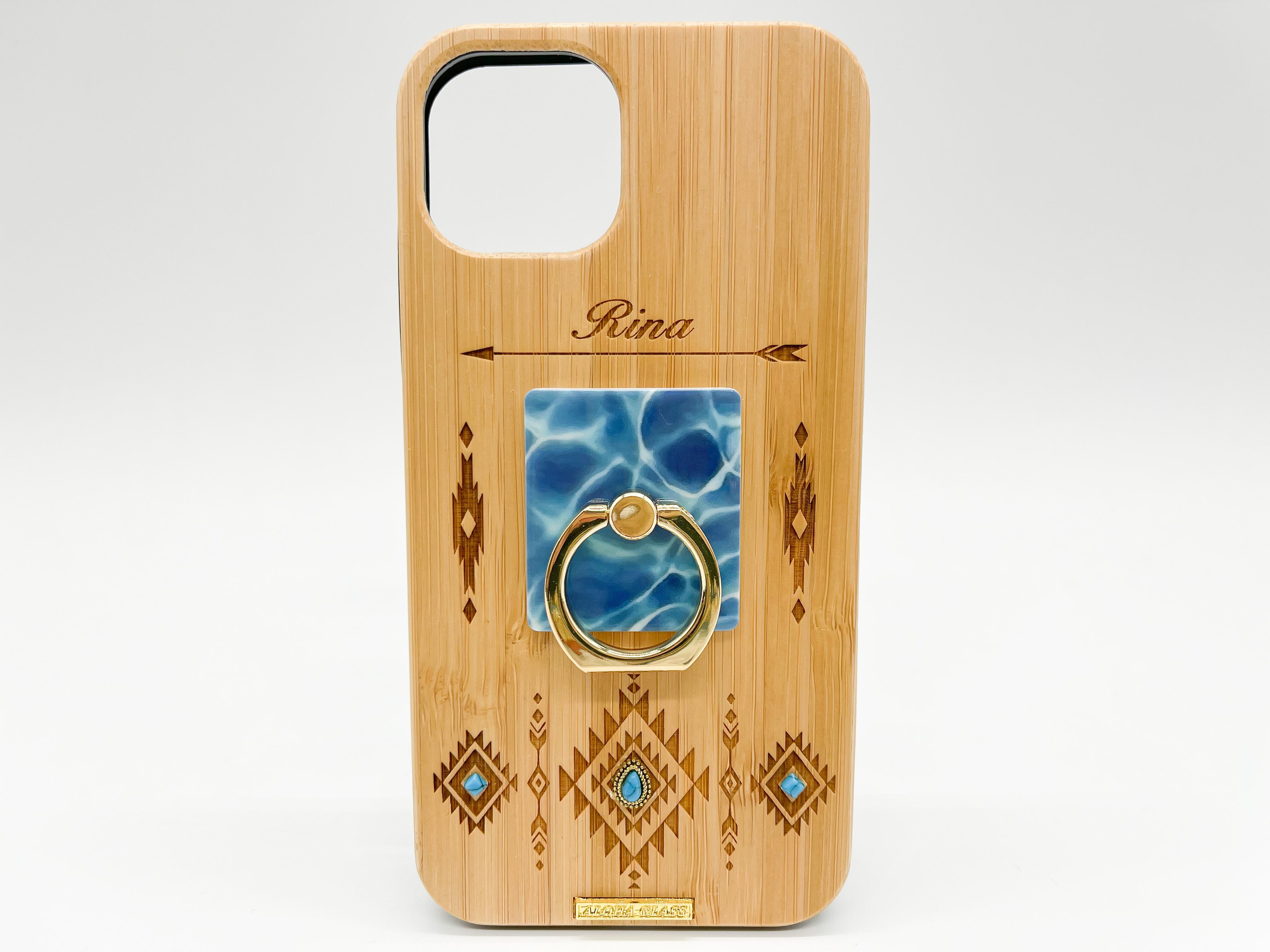 レーザーでデザインを彫ったWOOD+ブラックラバー(天然木+ブラックラバー)のケースになります。ケース下部にはオリジナルブランドロゴプレートをプラスしました。