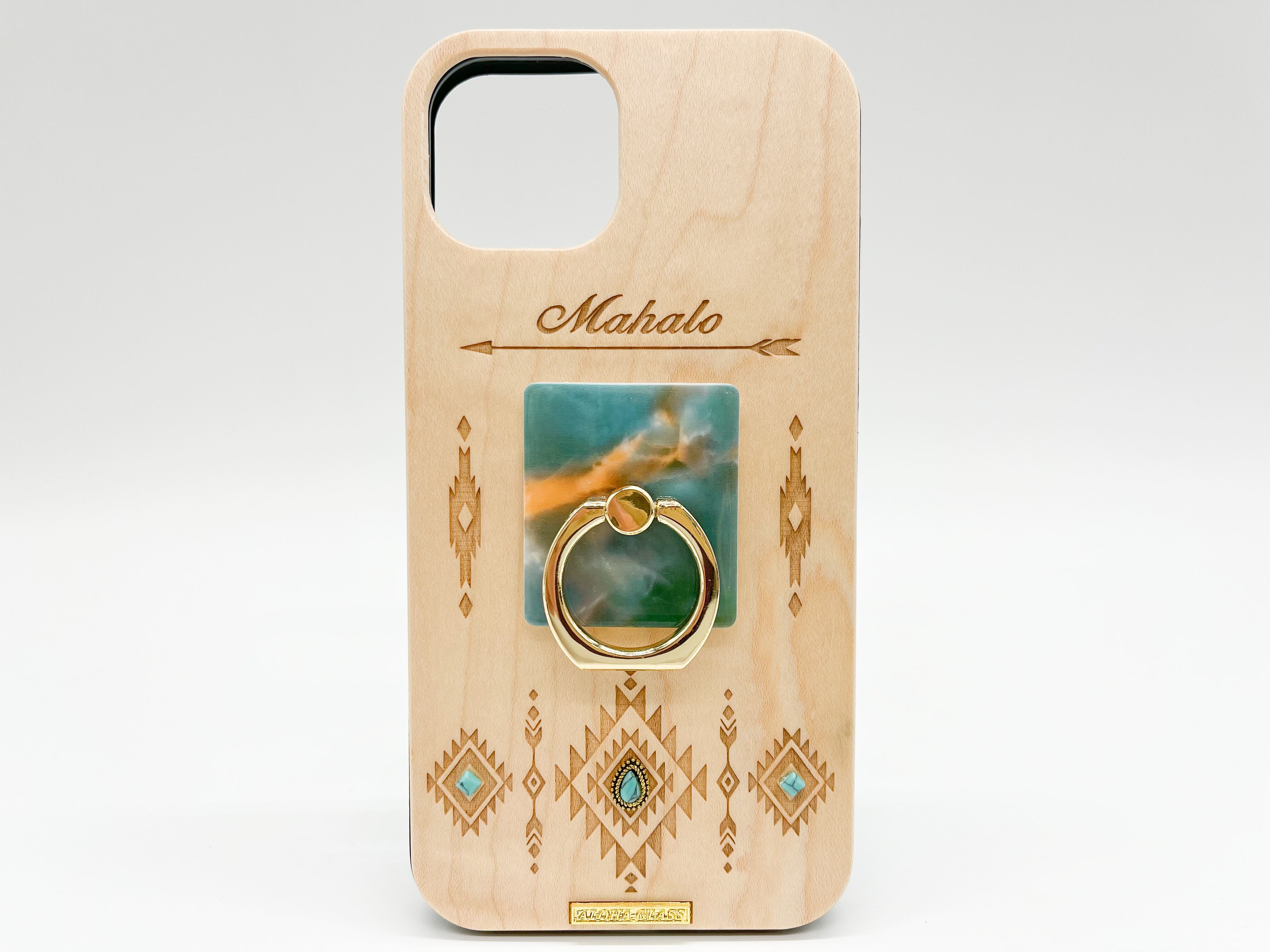 レーザーでデザインを彫ったWOOD+ブラックラバー(天然木+ブラックラバー)のケースになります。ケース下部にはオリジナルブランドロゴプレートをプラスしました。