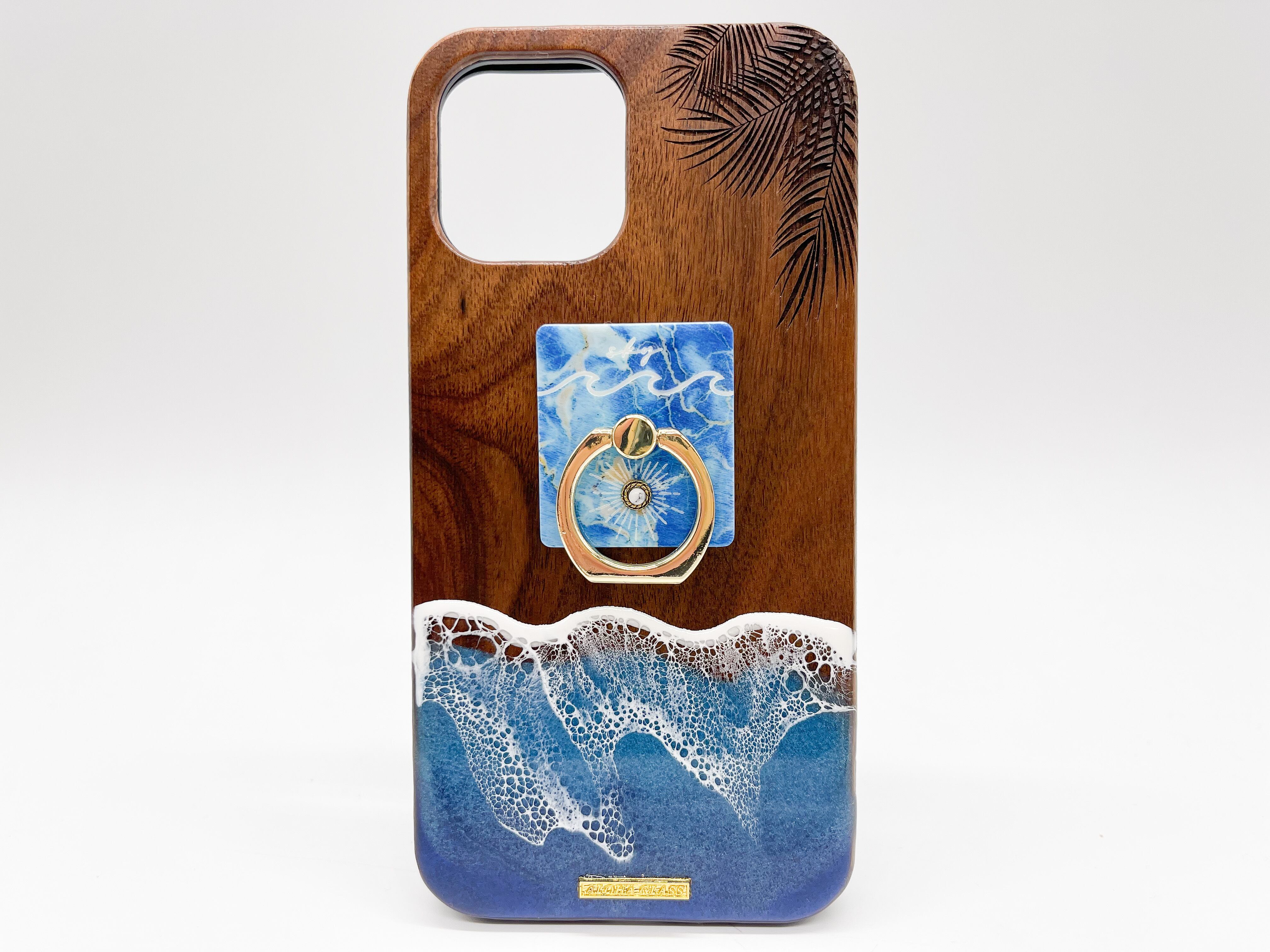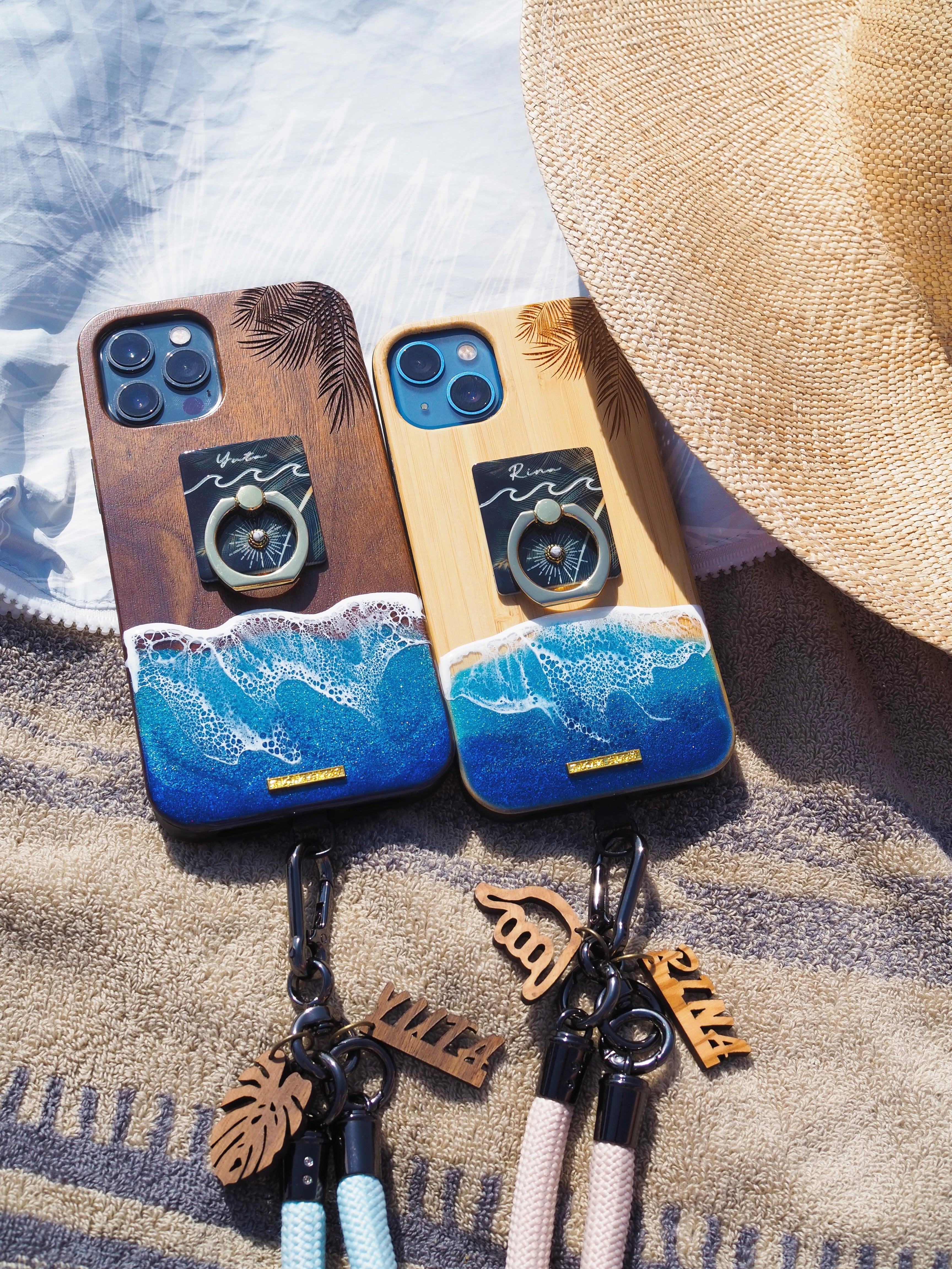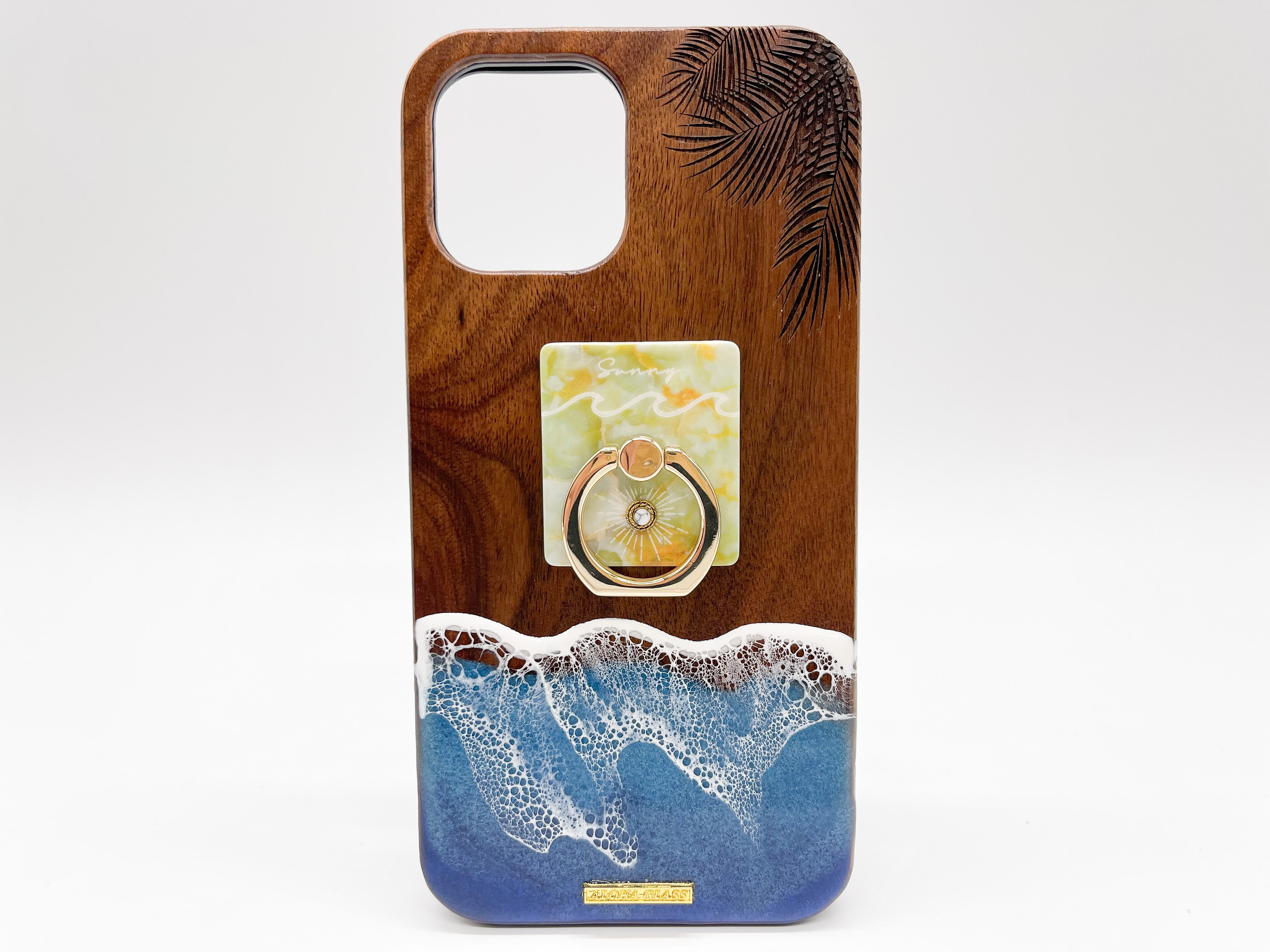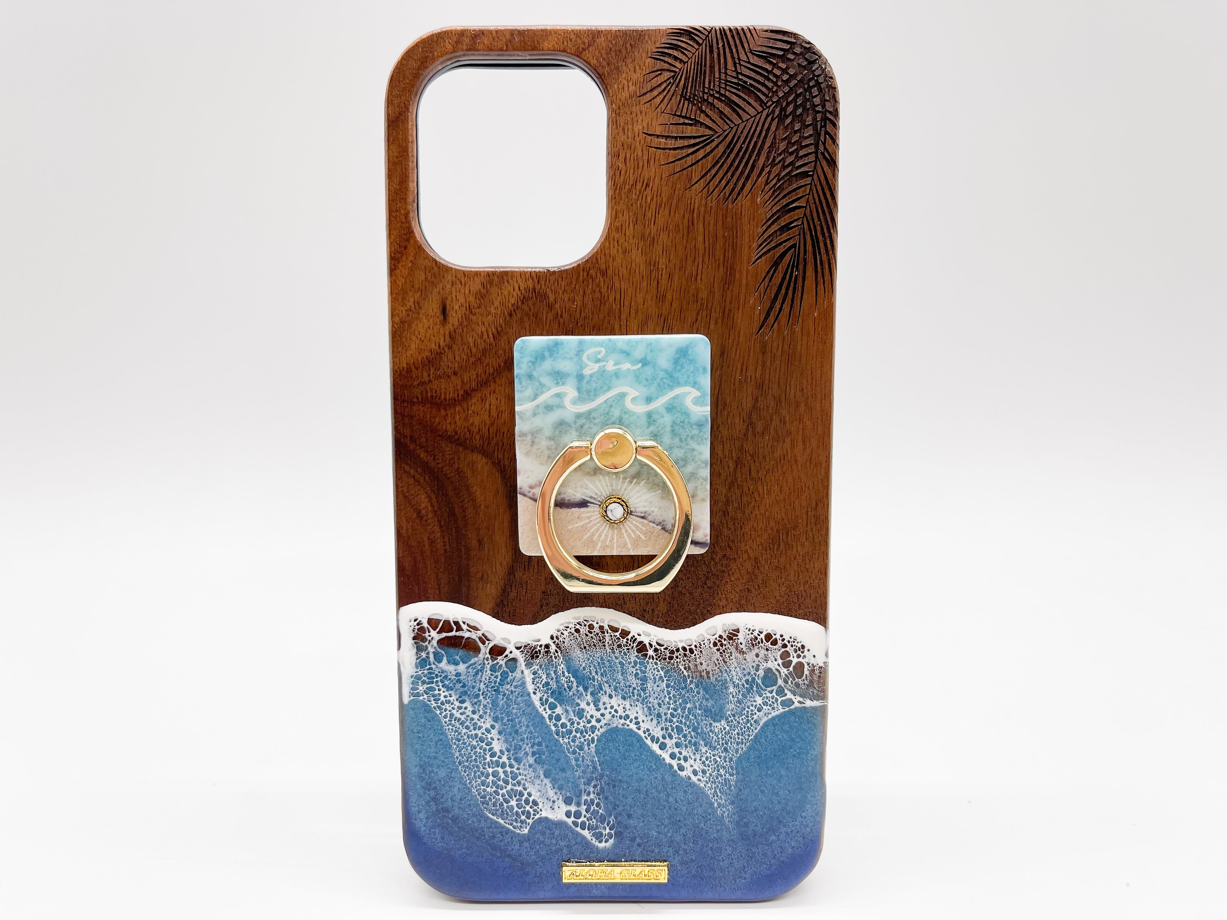 天然木製なのはもちろんのこと波のレジン加工も全て手作業で行い、オリジナルのリングを付けることでALOHA GLASSしか作れない、絶対に誰とも被ることのないあなただけのケースです。
