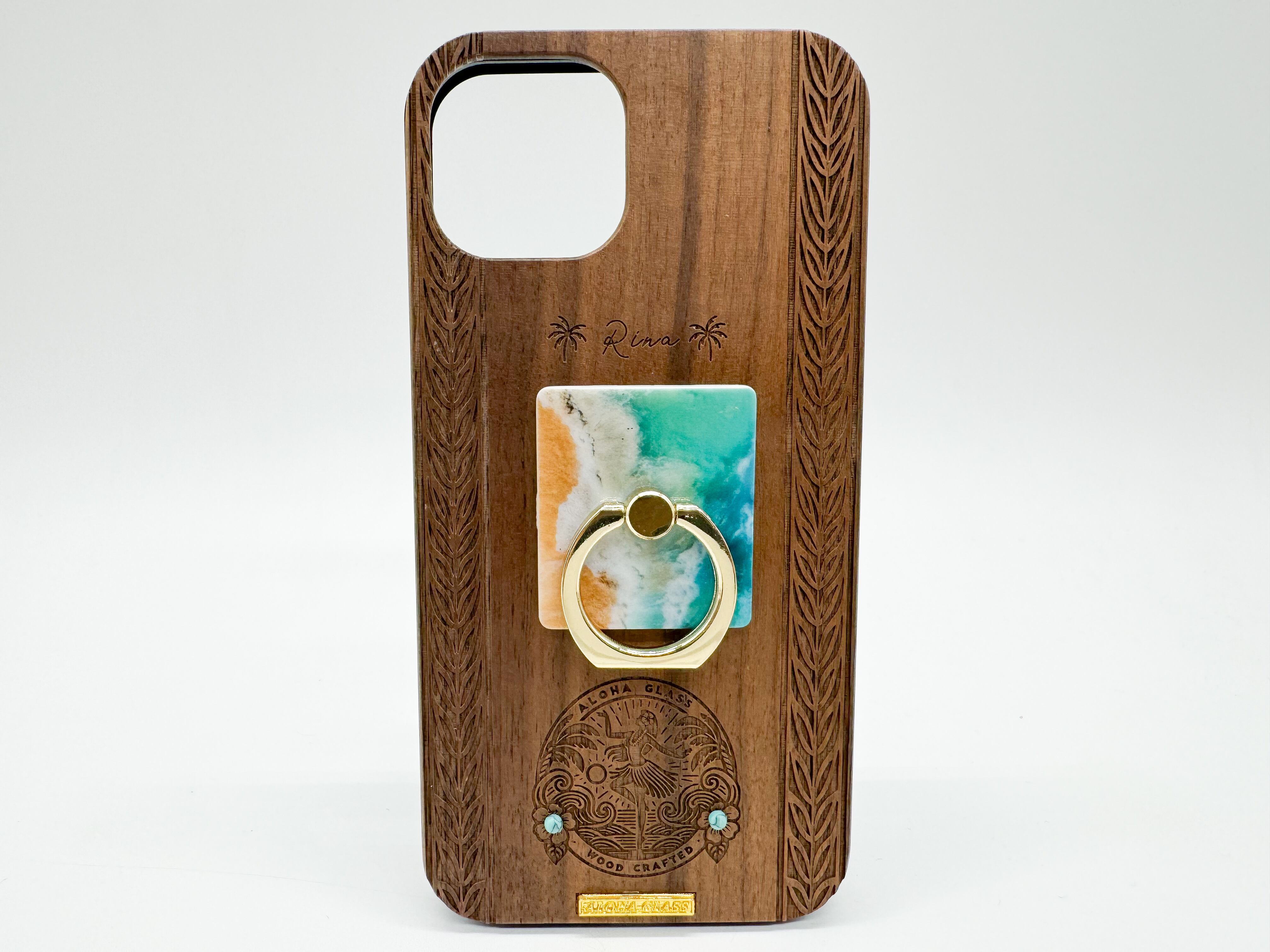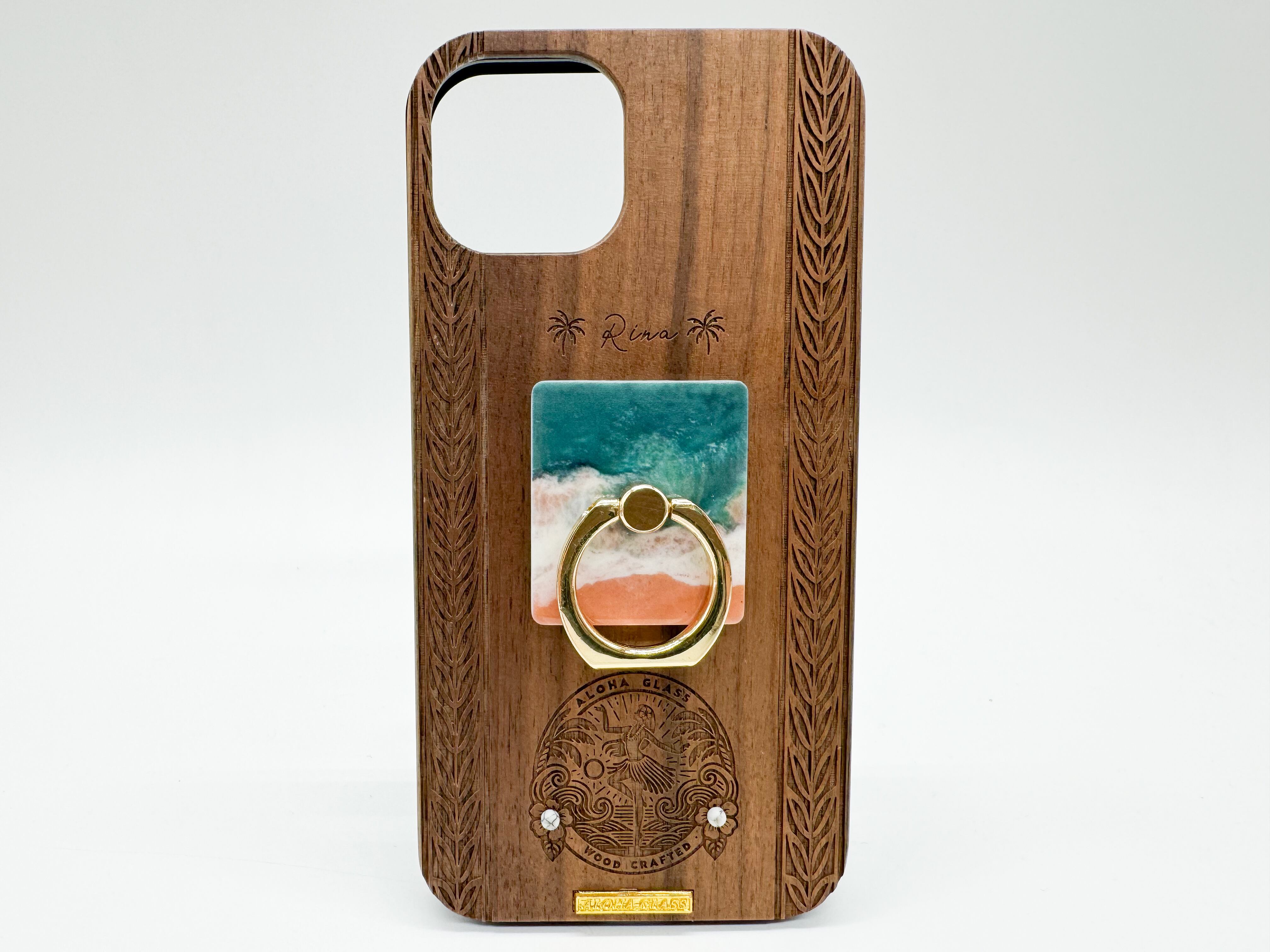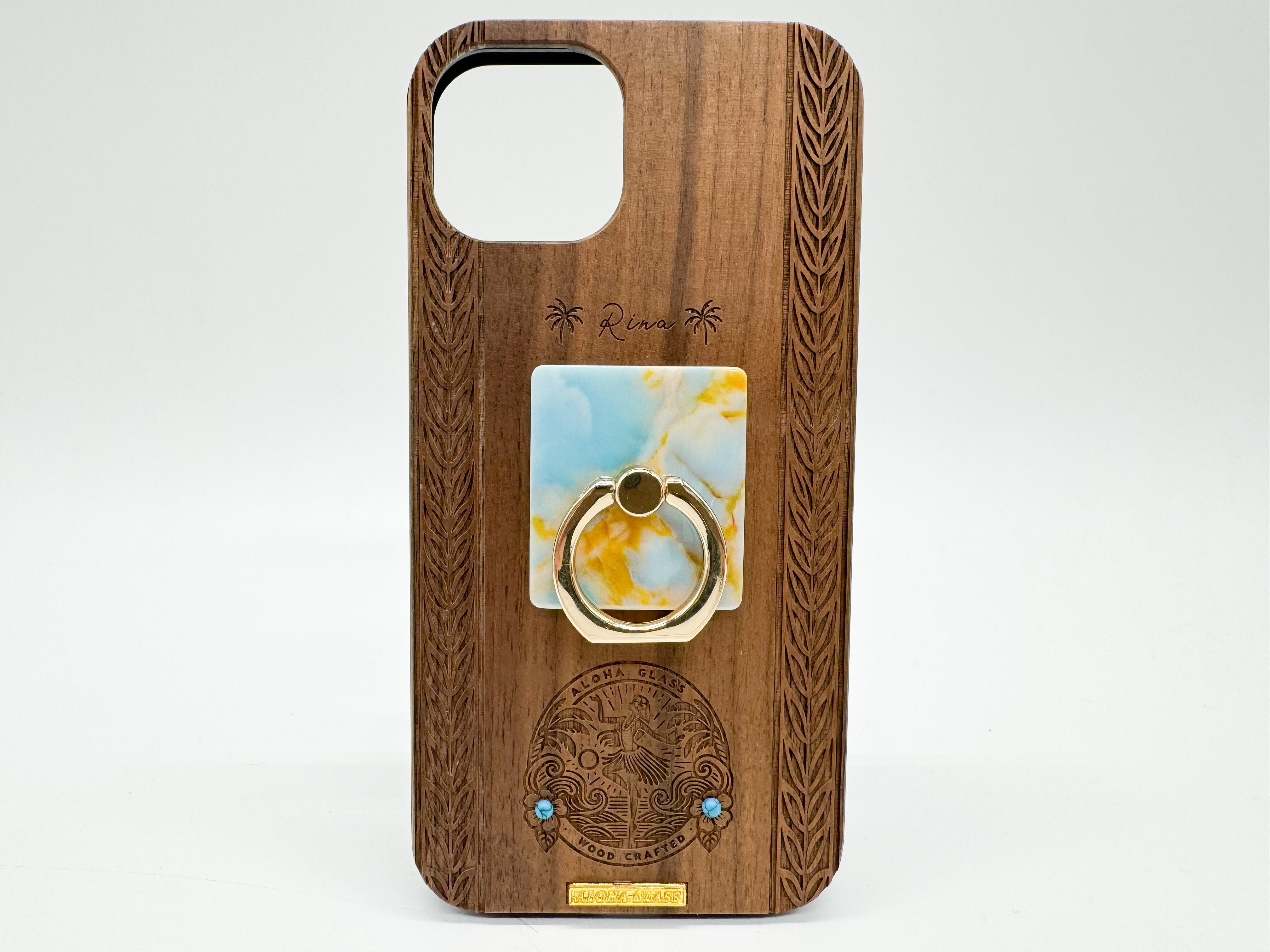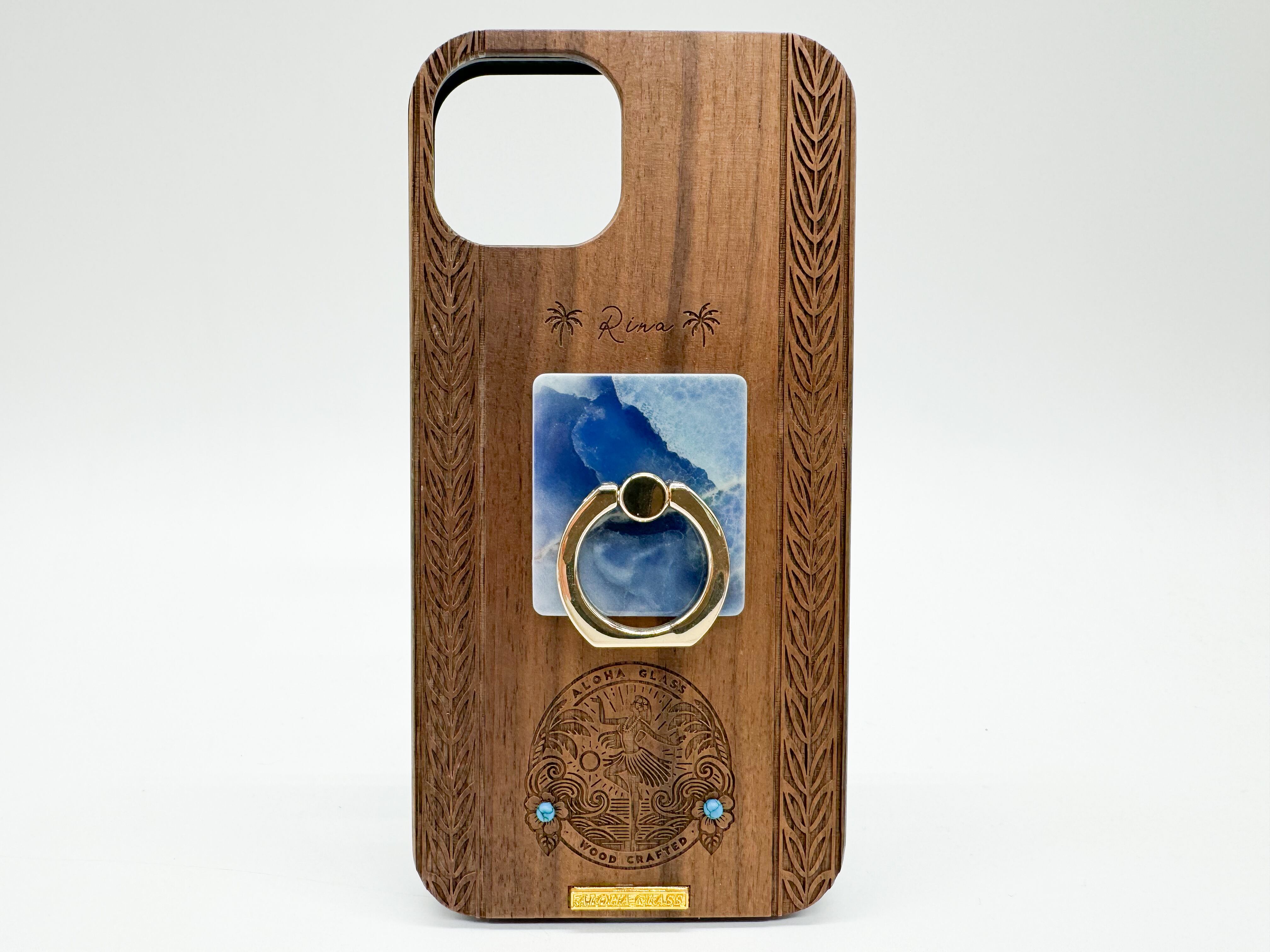 レーザーでデザインを彫ったWOOD+ブラックラバー(天然木+ブラックラバー)のケースになります。ケース下部にはオリジナルブランドロゴプレートをプラスしました。