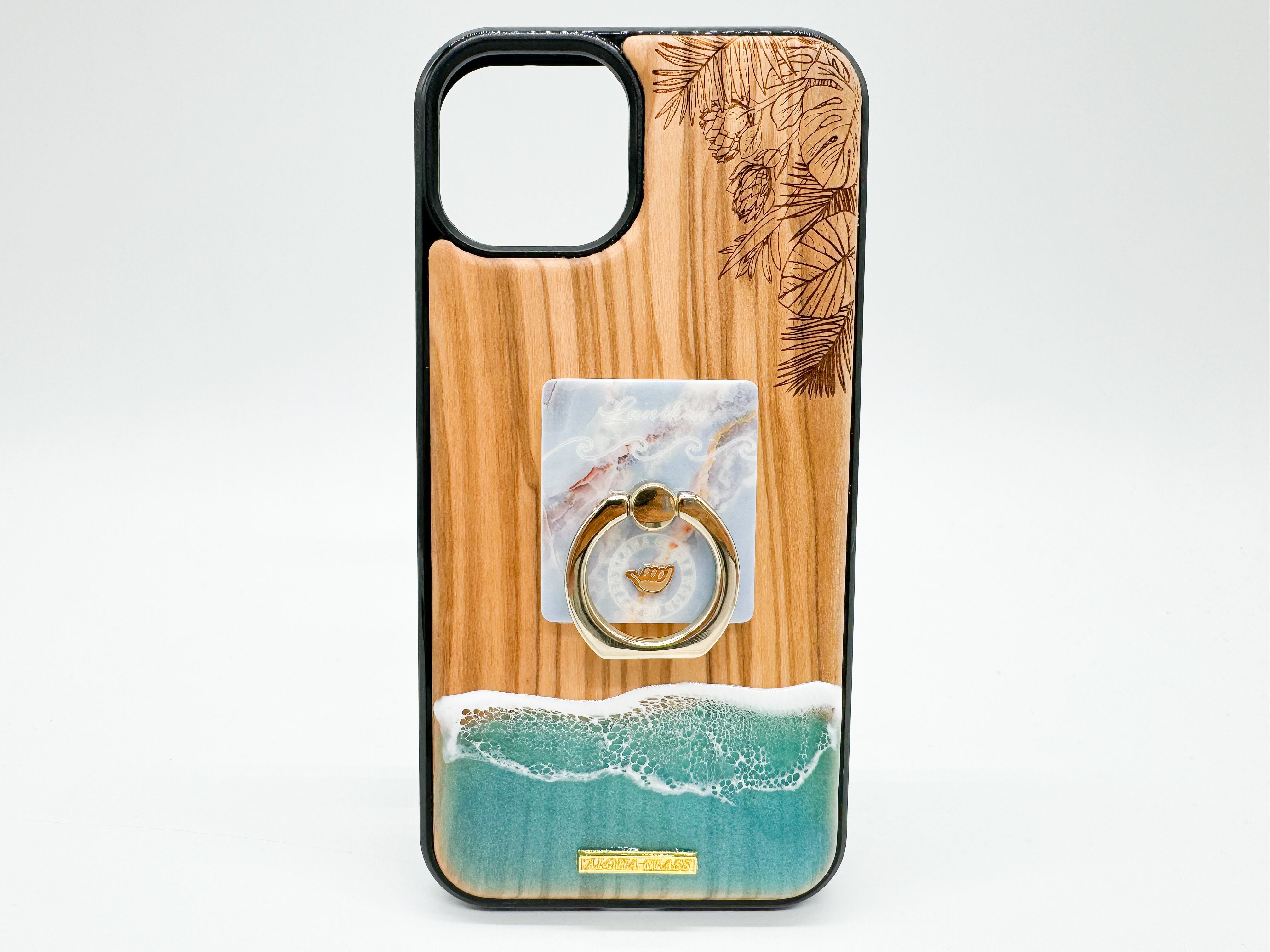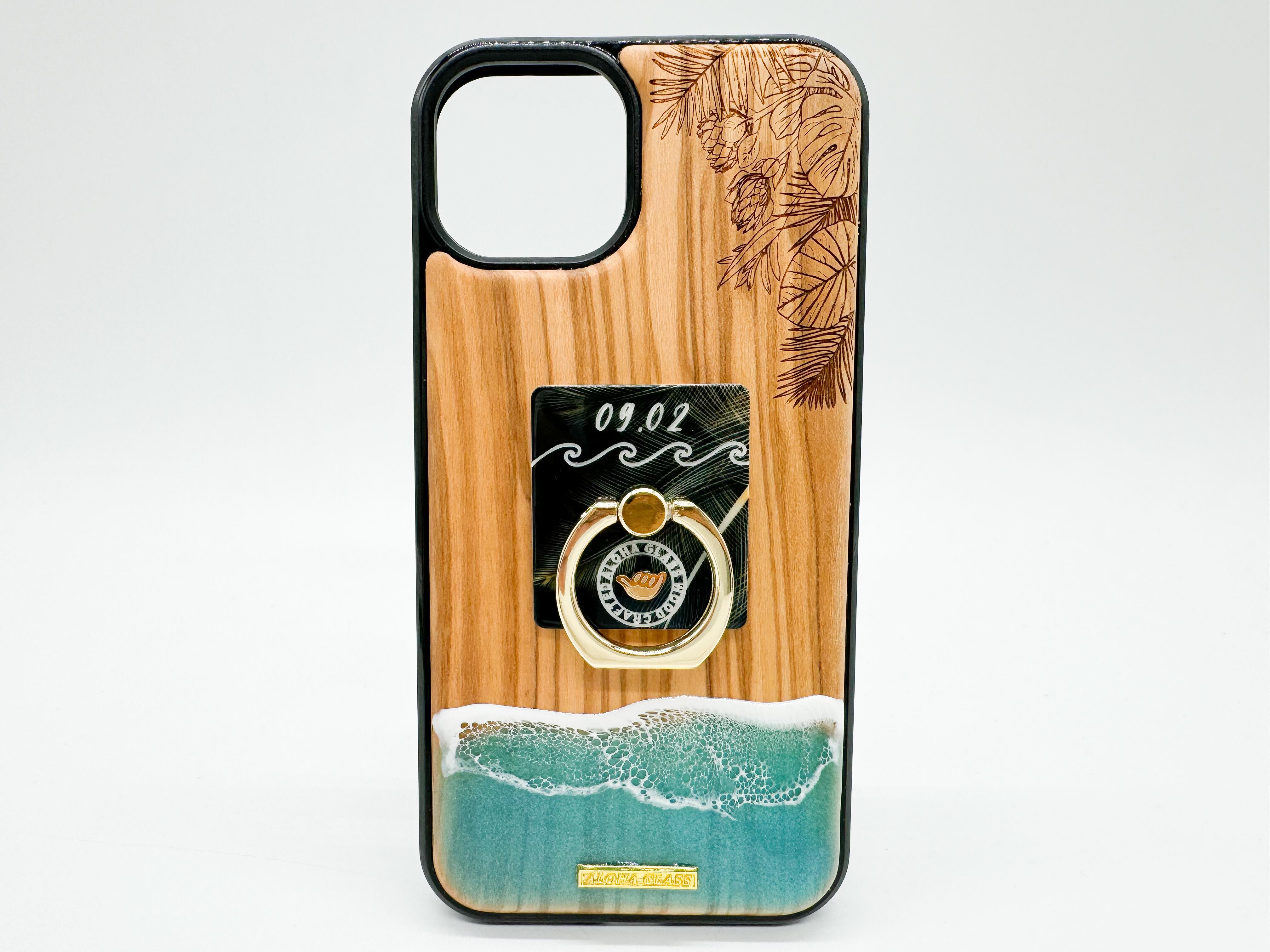 天然木製なのはもちろんのこと波のレジン加工も全て手作業で行い、オリジナルのリングを付けることでALOHA GLASSしか作れない、絶対に誰とも被ることのないあなただけのケースです。