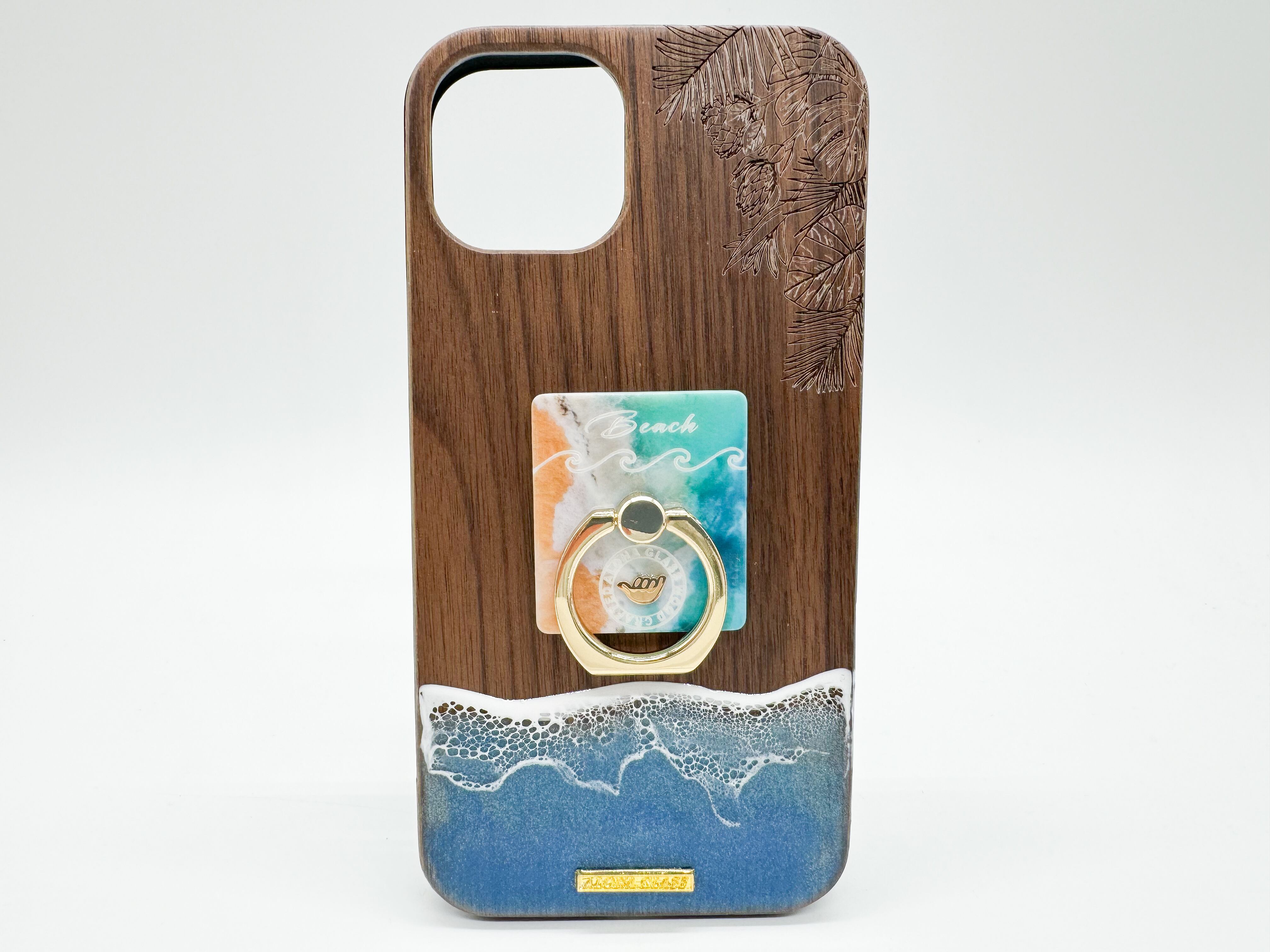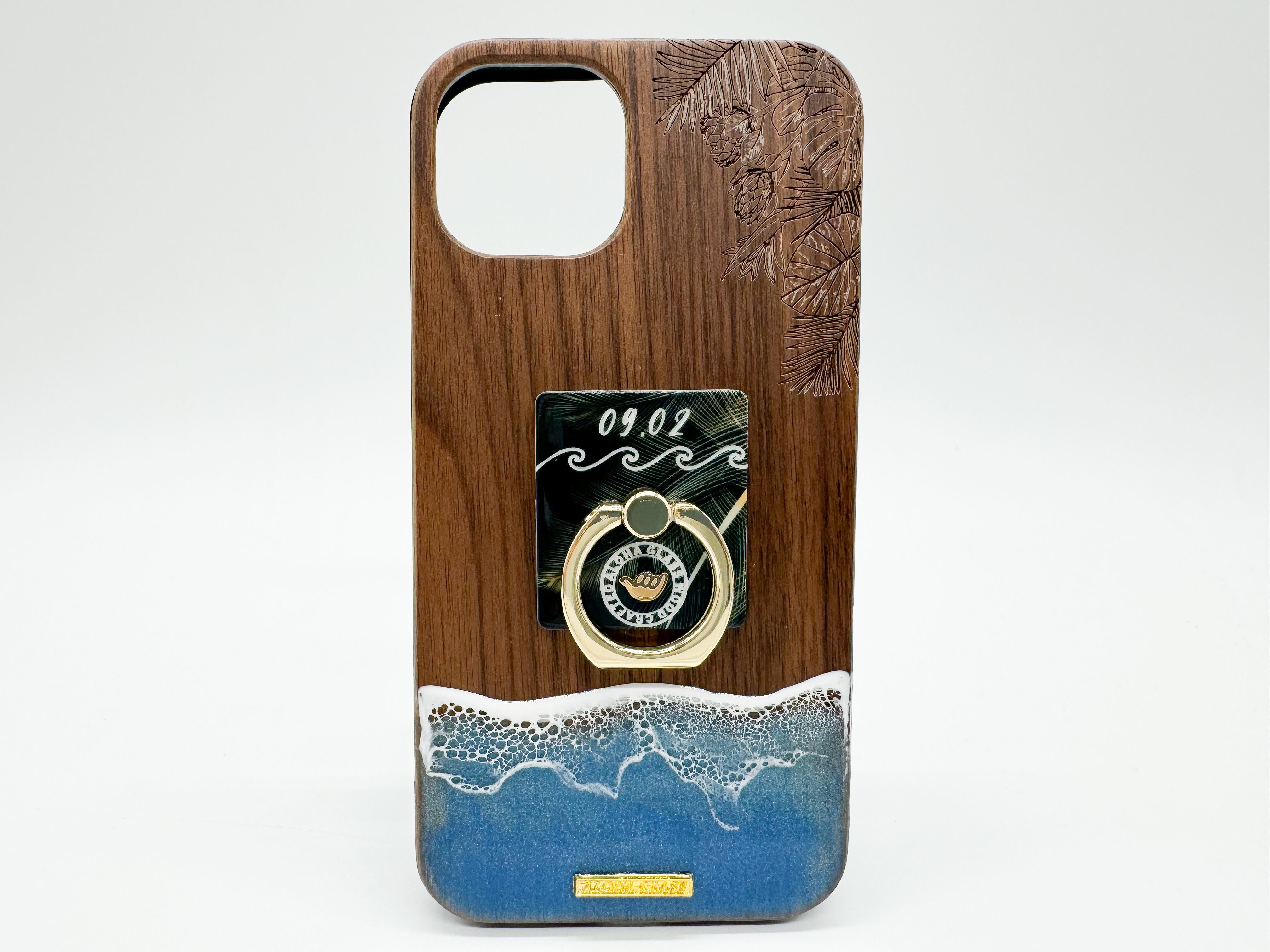 天然木製なのはもちろんのこと波のレジン加工も全て手作業で行い、オリジナルのリングを付けることでALOHA GLASSしか作れない、絶対に誰とも被ることのないあなただけのケースです。