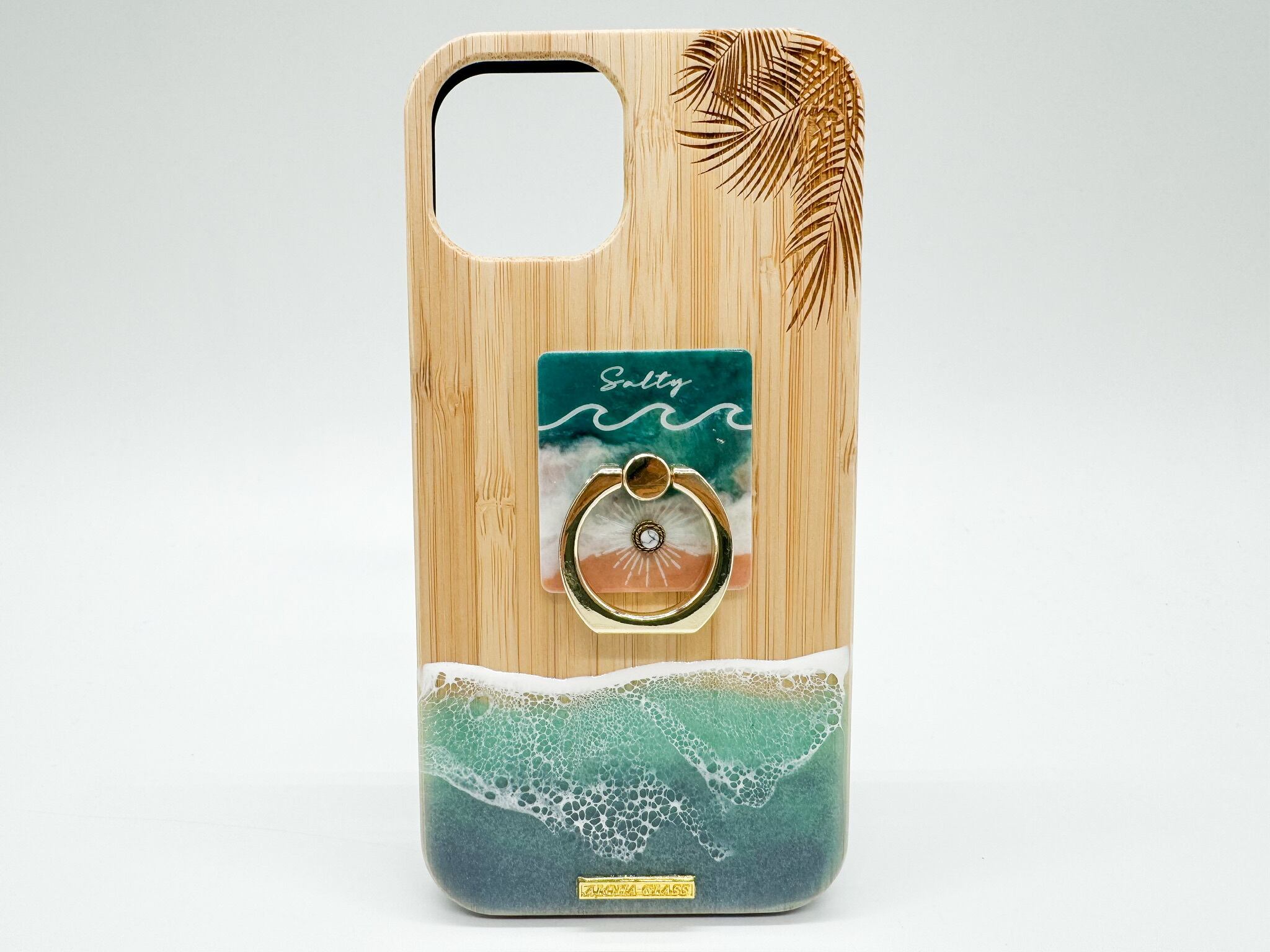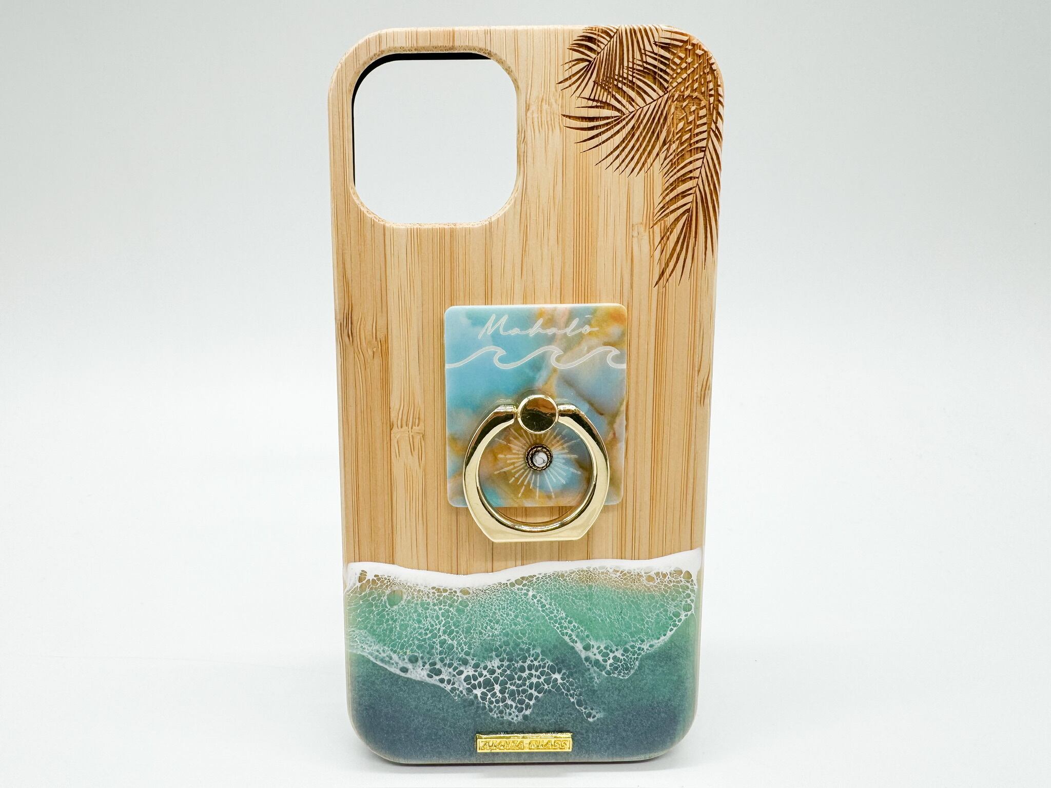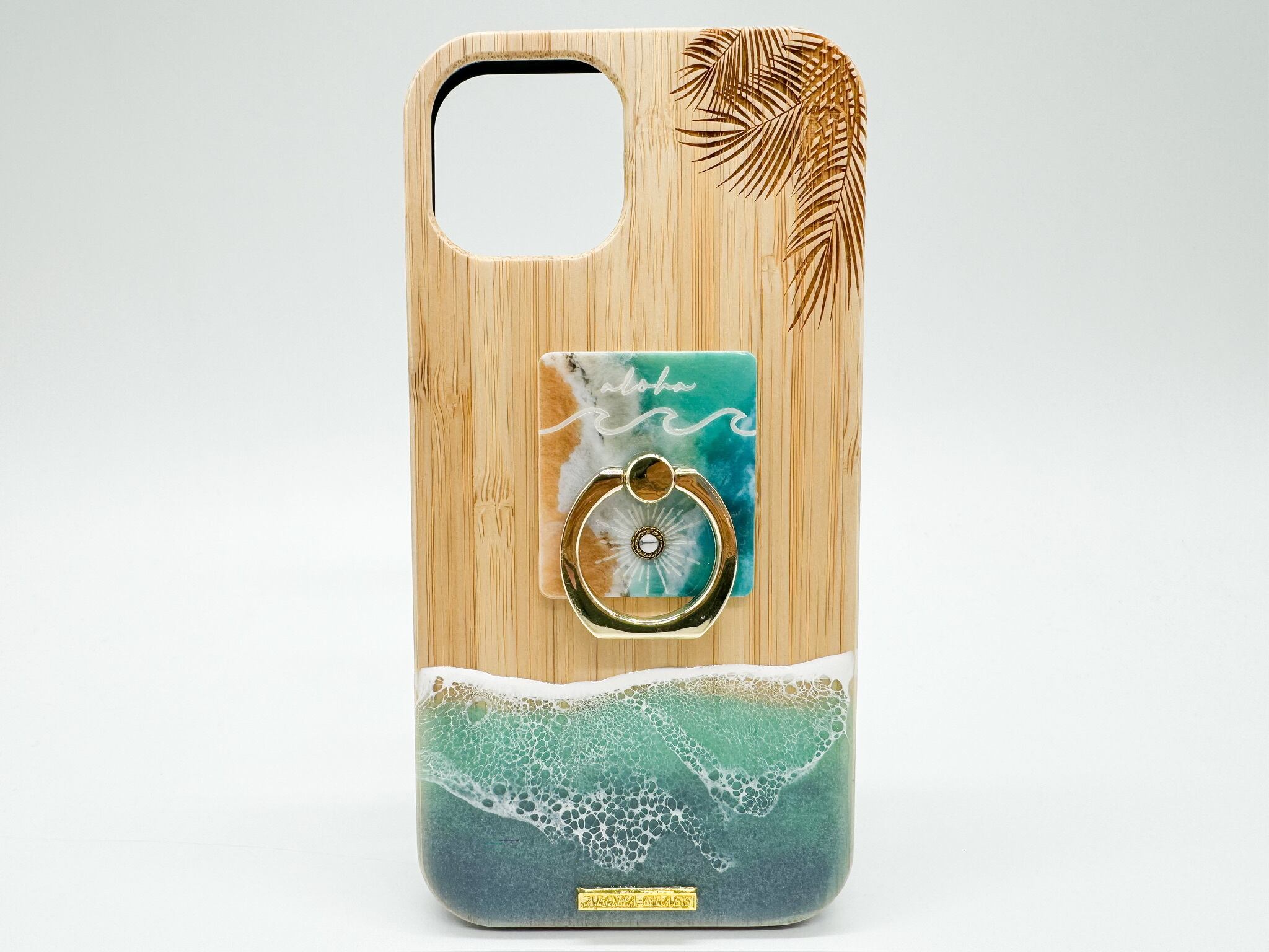 天然木製なのはもちろんのこと波のレジン加工も全て手作業で行い、オリジナルのリングを付けることでALOHA GLASSしか作れない、絶対に誰とも被ることのないあなただけのケースです。