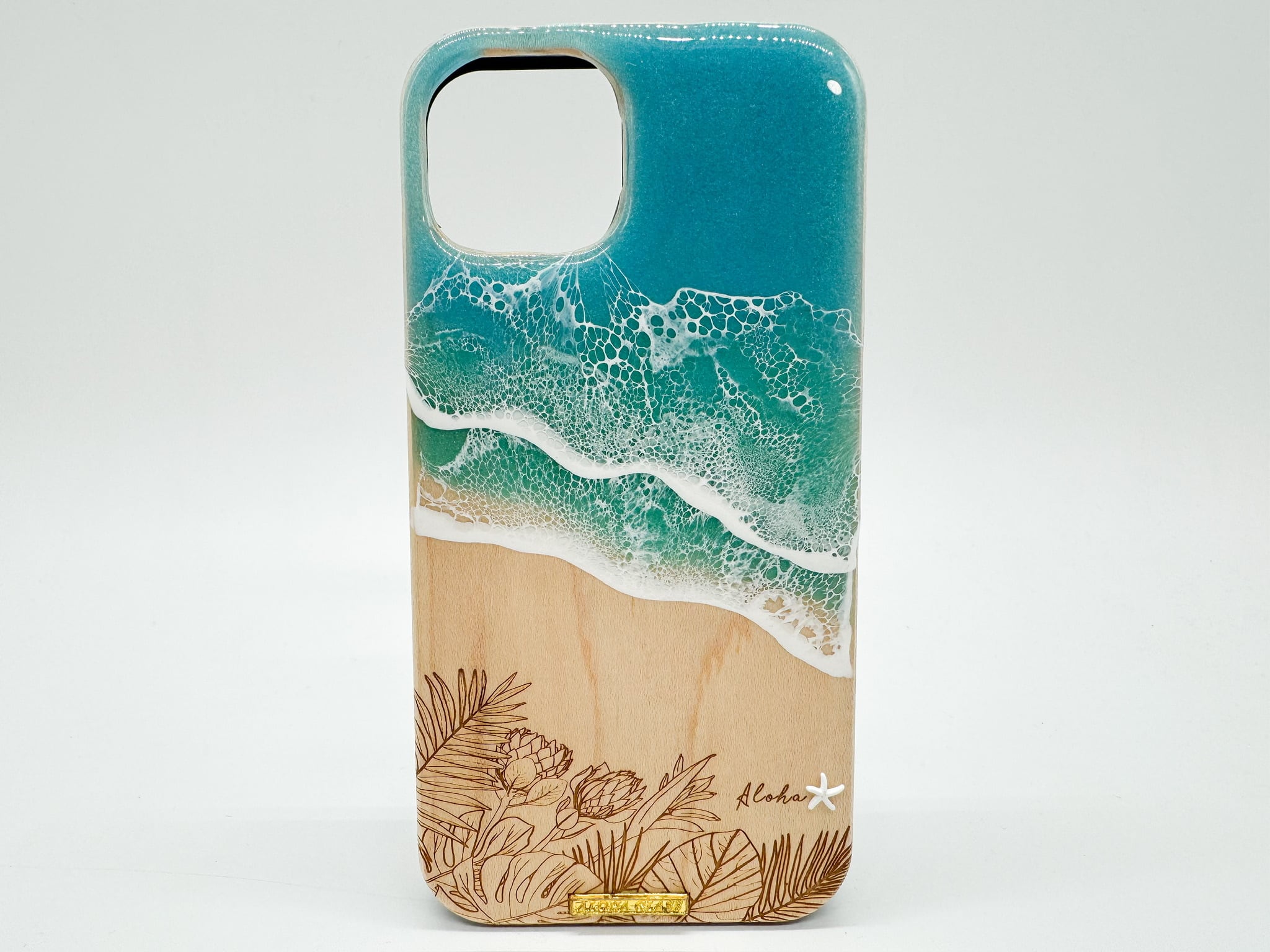 天然木製なのはもちろんのこと波のレジン加工も全て手作業で行うため同じ物が2度と生まれることはなく絶対に誰とも被ることのないあなただけのケースです。