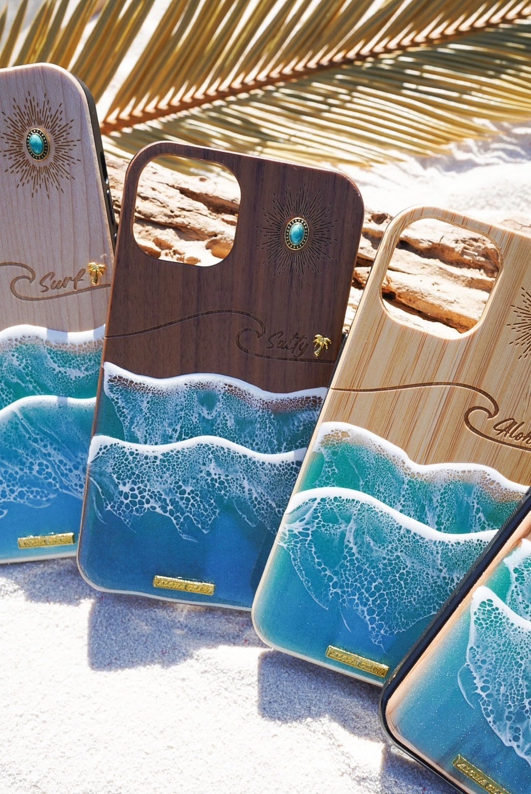 天然木製なのはもちろんのこと波のレジン加工も全て手作業で行うため同じ物が2度と生まれることはなく絶対に誰とも被ることのないあなただけのケースです。