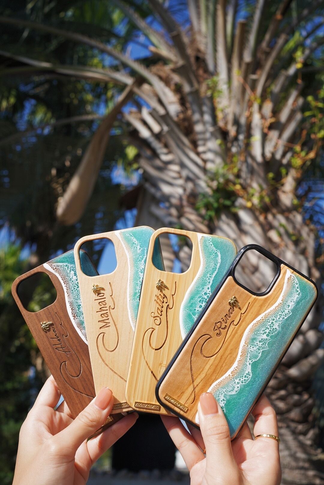 天然木製なのはもちろんのこと波のレジン加工も全て手作業で行うため同じ物が2度と生まれることはなく絶対に誰とも被ることのないあなただけのケースです。