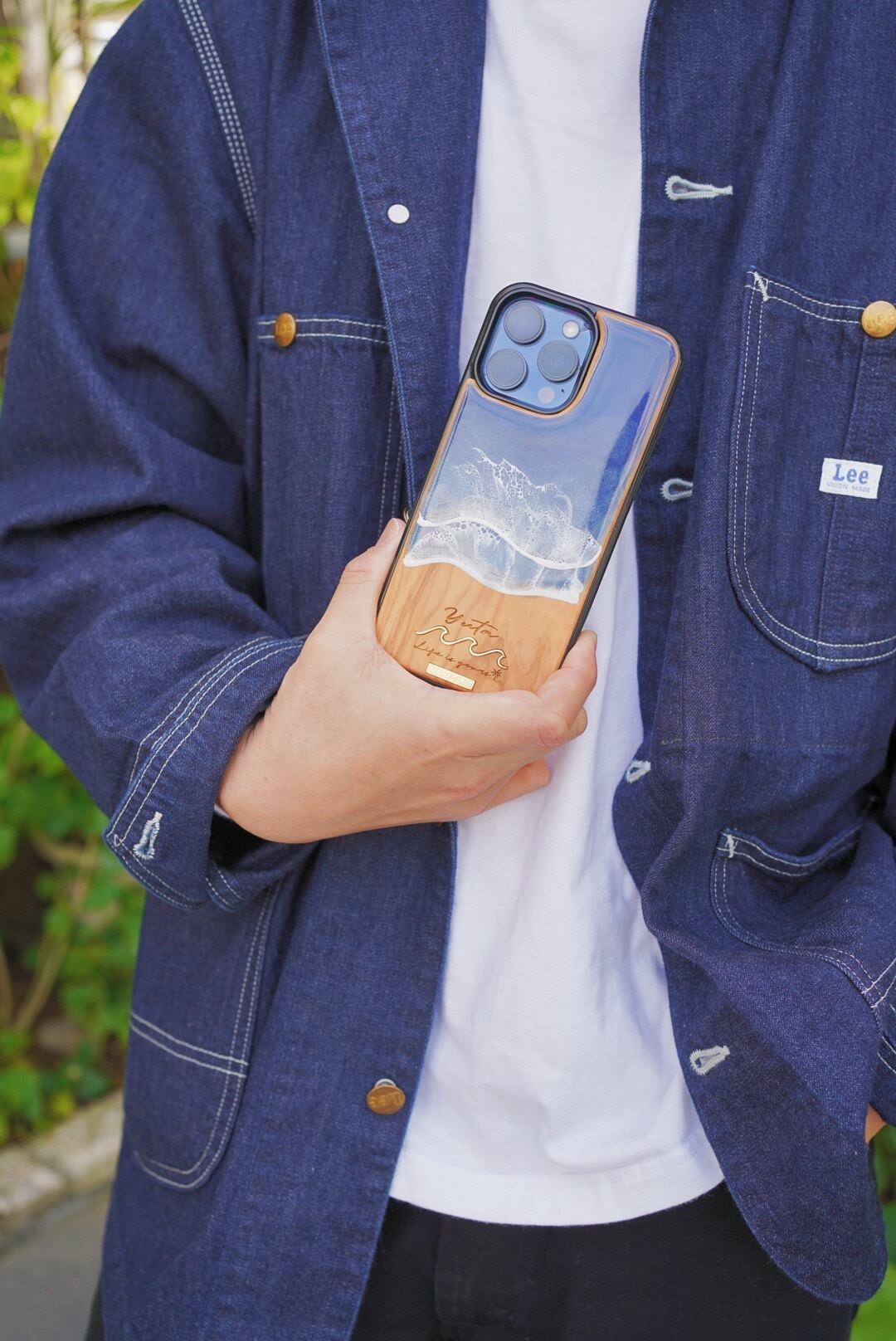天然木製なのはもちろんのこと波のレジン加工も全て手作業で行うため同じ物が2度と生まれることはなく絶対に誰とも被ることのないあなただけのケースです。