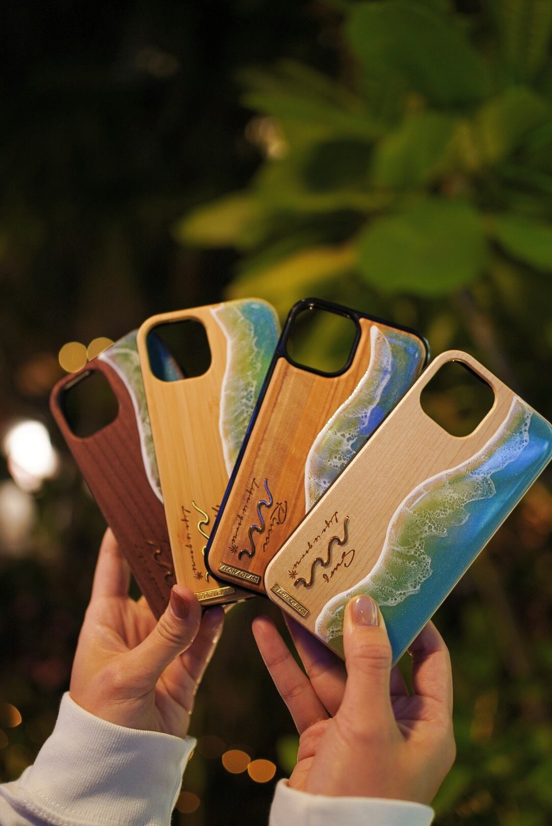 天然木製なのはもちろんのこと波のレジン加工も全て手作業で行うため同じ物が2度と生まれることはなく絶対に誰とも被ることのないあなただけのケースです。