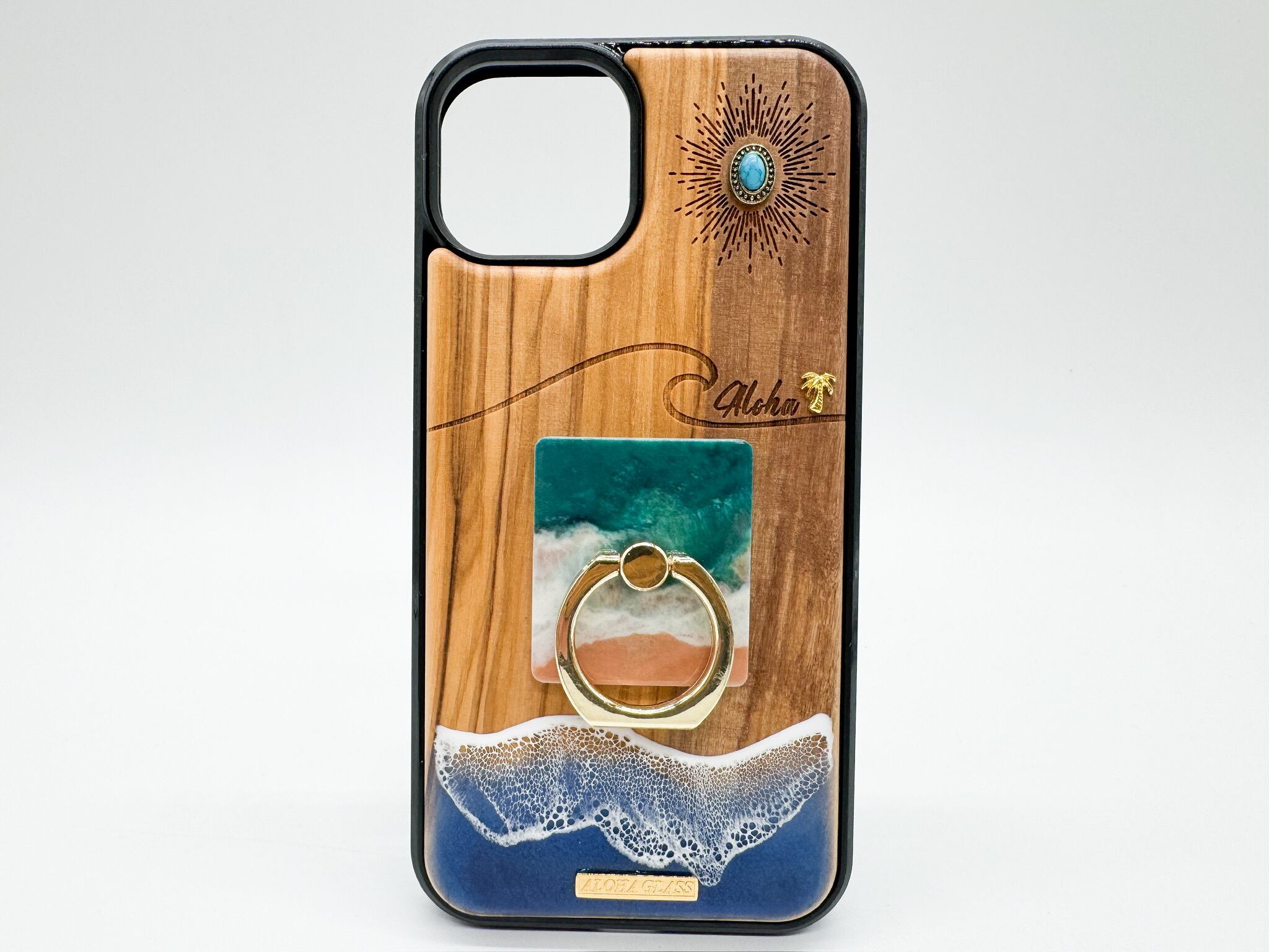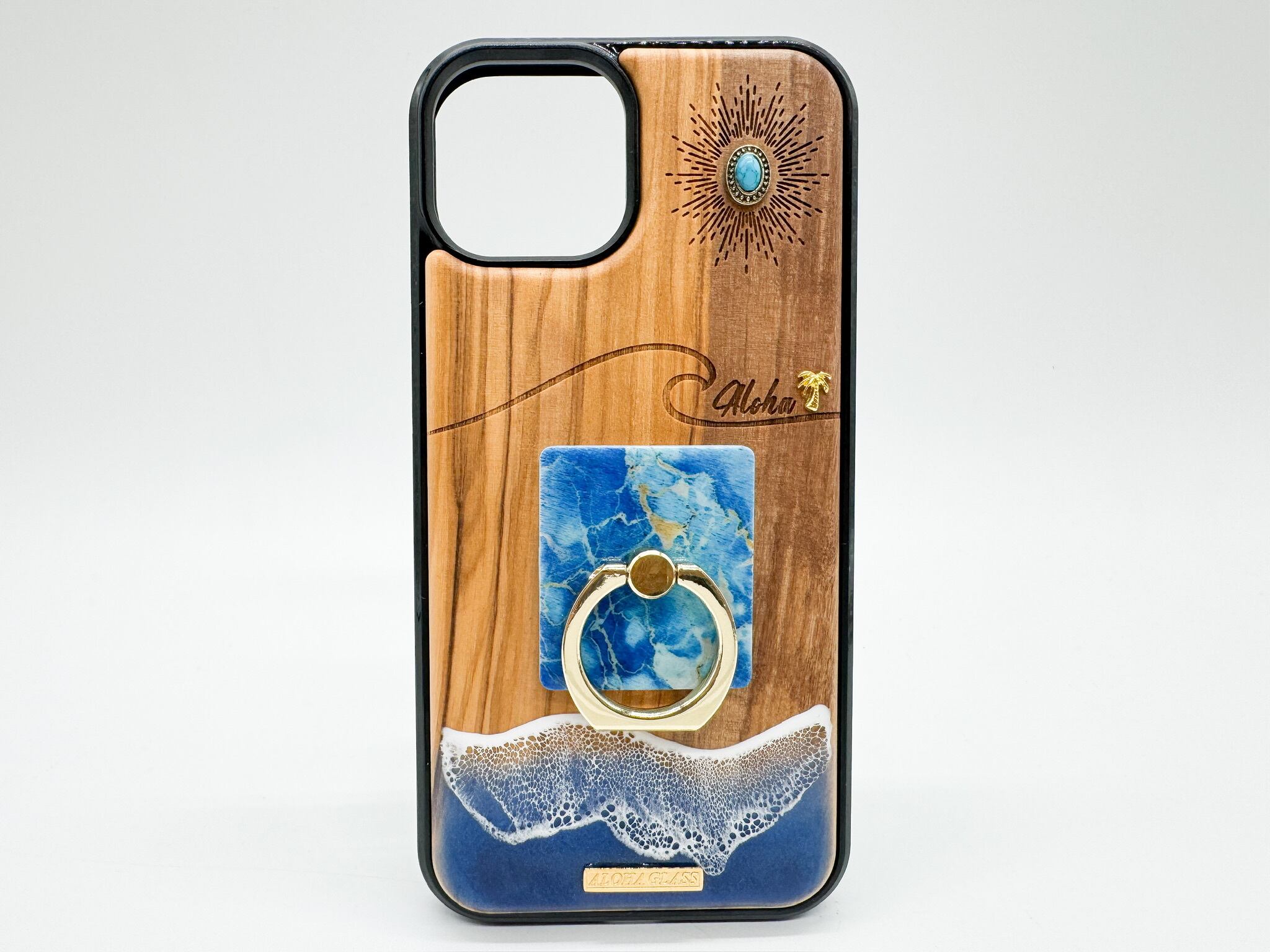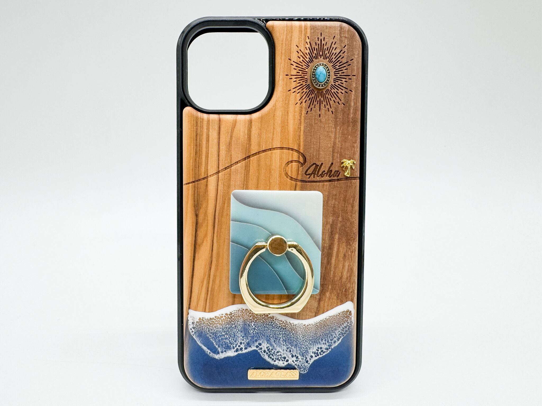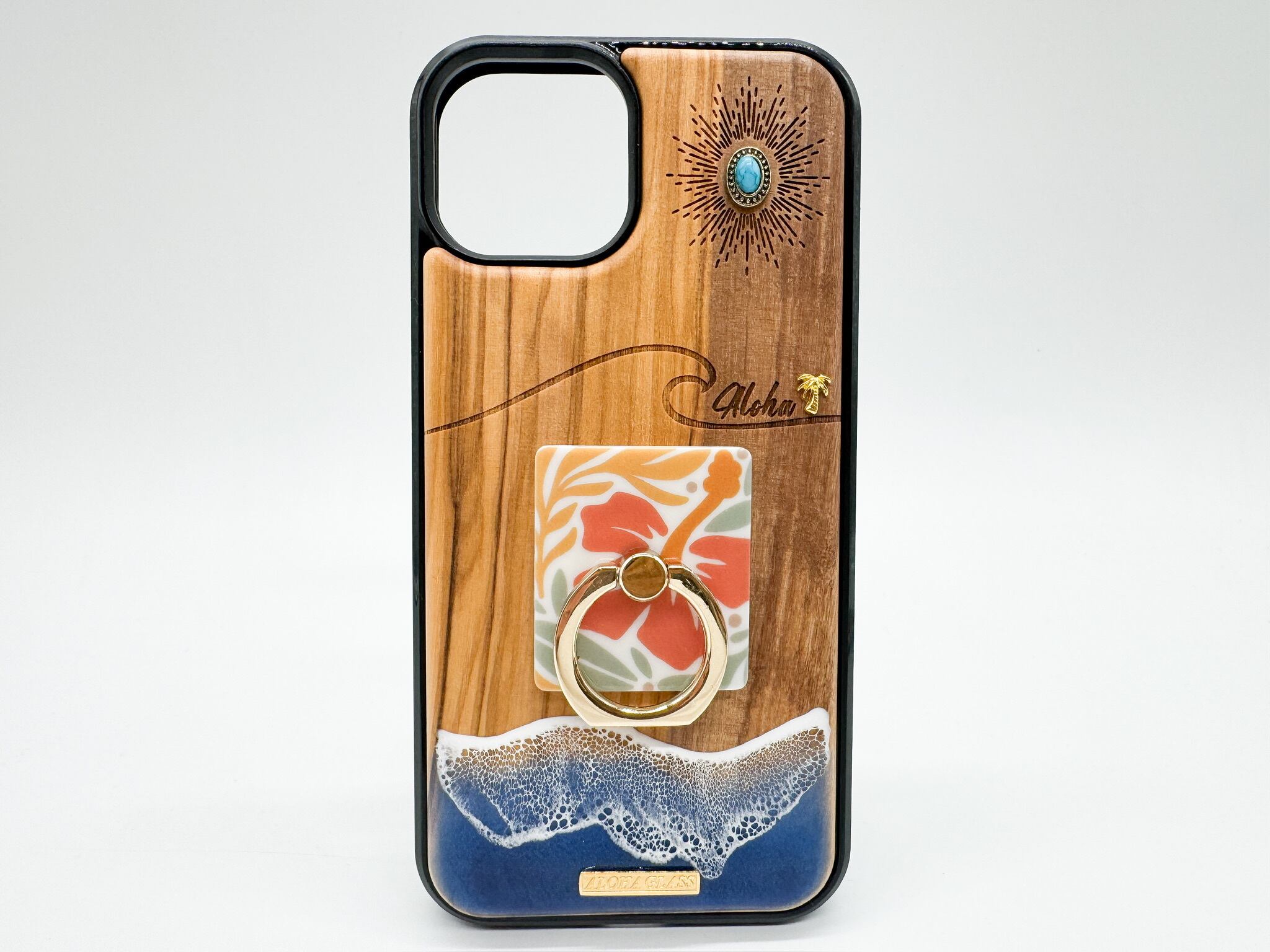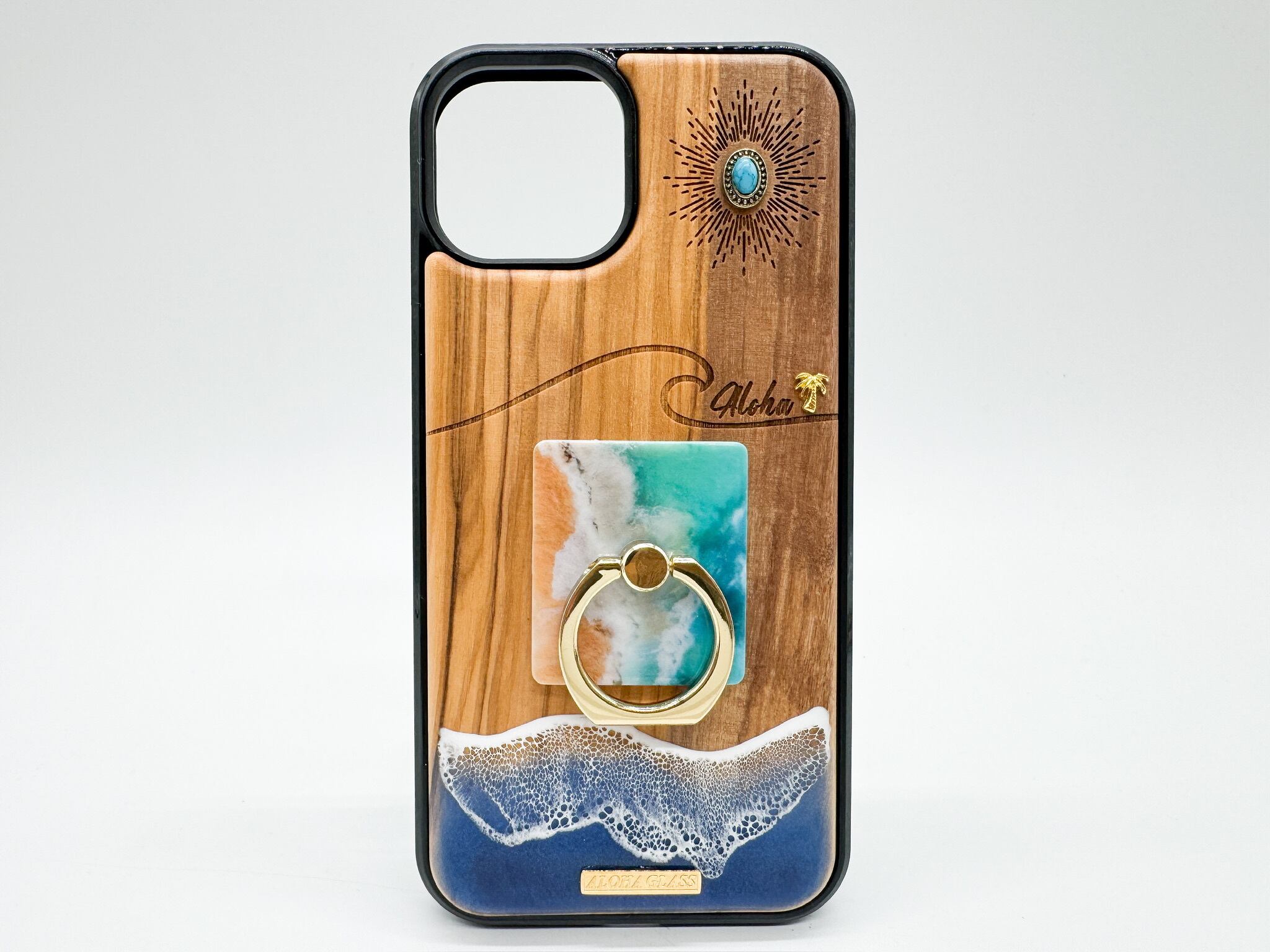 天然木製なのはもちろんのこと波のレジン加工も全て手作業で行い、オリジナルのリングを付けることでALOHA GLASSしか作れない、絶対に誰とも被ることのないあなただけのケースです。