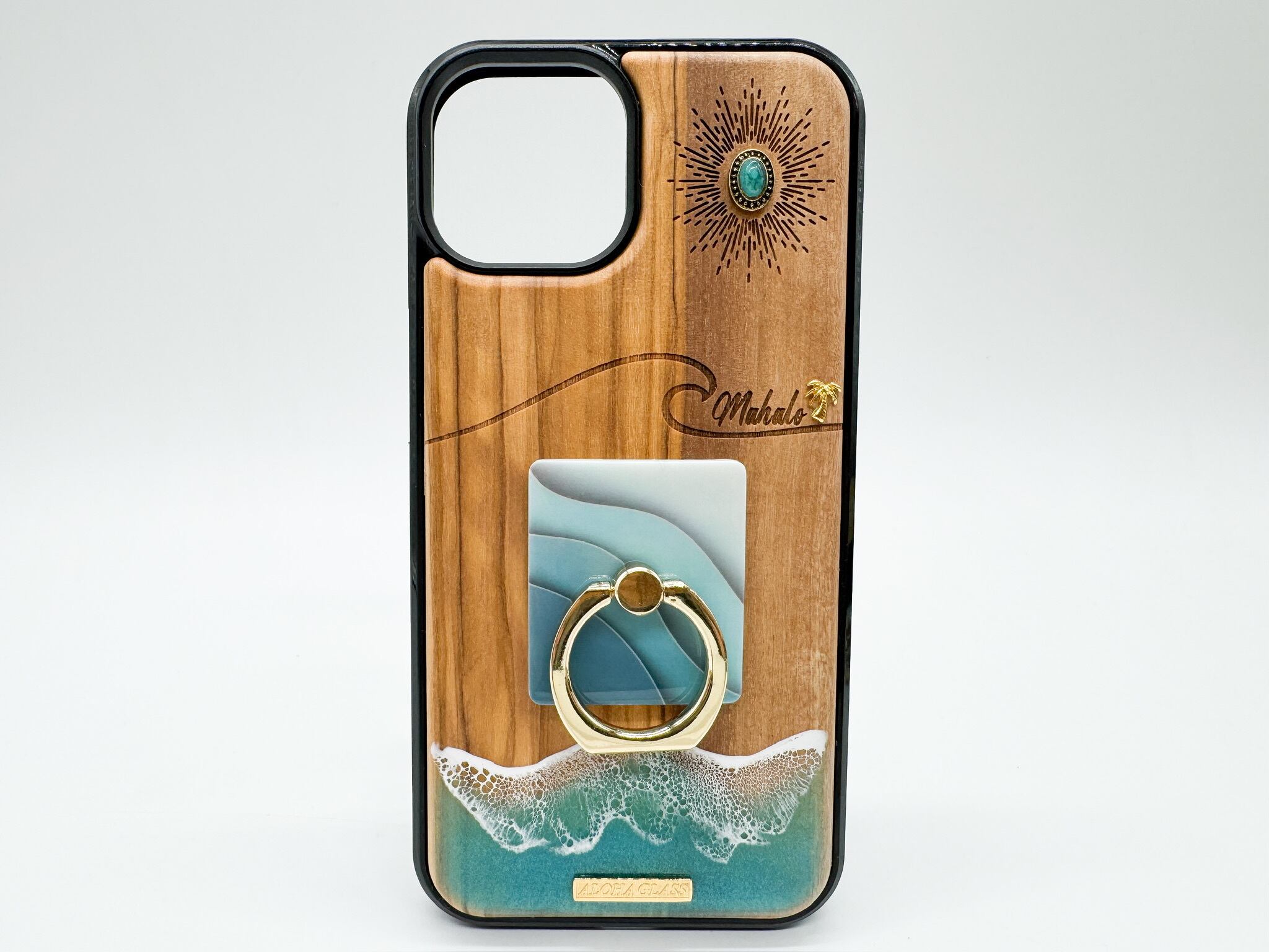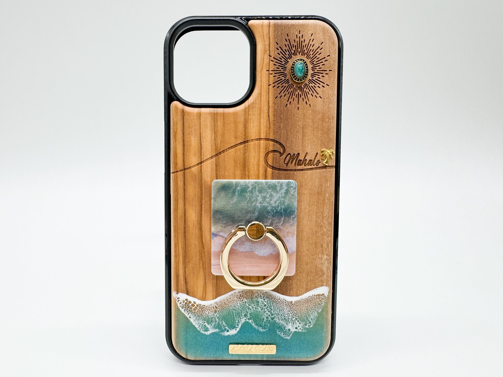 天然木製なのはもちろんのこと波のレジン加工も全て手作業で行い、オリジナルのリングを付けることでALOHA GLASSしか作れない、絶対に誰とも被ることのないあなただけのケースです。